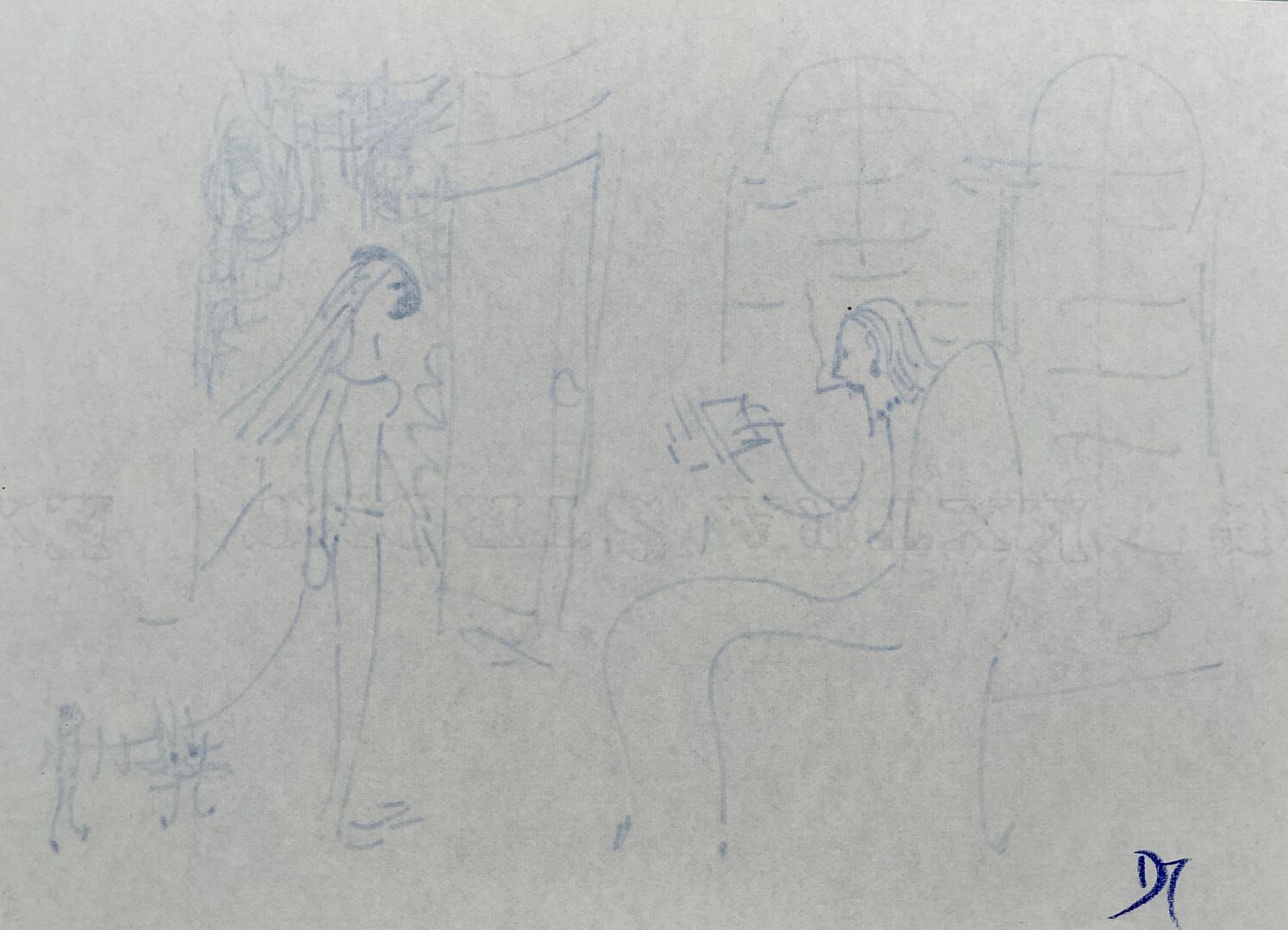 112 RÉSULTAT: 300 € ESTIMATION: 150 / 250 € Dora MAAR (1907-1997) Scène d’intérieur Feutre bleu sur papier, tampon de la vente de l’atelier en 1998 en bas à droite, monogrammé au dos 21 x 29.5 cm
