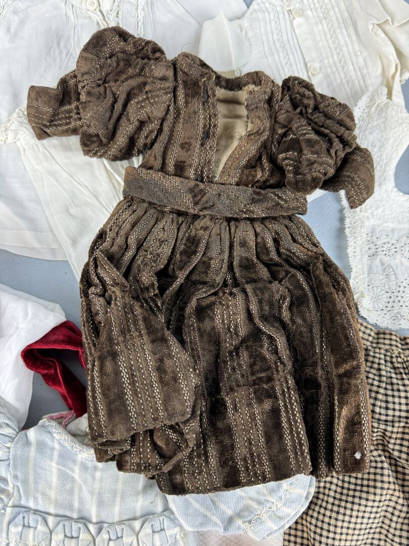 153 RÉSULTAT: 190 € ESTIMATION: 100 / 150 € Trousseau de vêtements de poupées anciens et modernes, dentelles, velours, robes, coiffure et accessoires