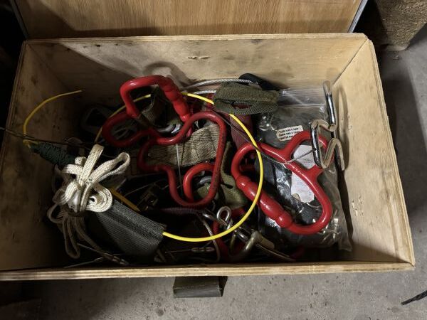 Ensemble d’accessoires dont porte-chargeurs et logements de transport divers pour brêlage tactique, certains camouflés, fermeture par scratch ou pression, ceintures, bretelles, cordages… On y joint deux grands sacs à dos, deux drapeaux de pavoisement français et un important ensemble de sacs à sable