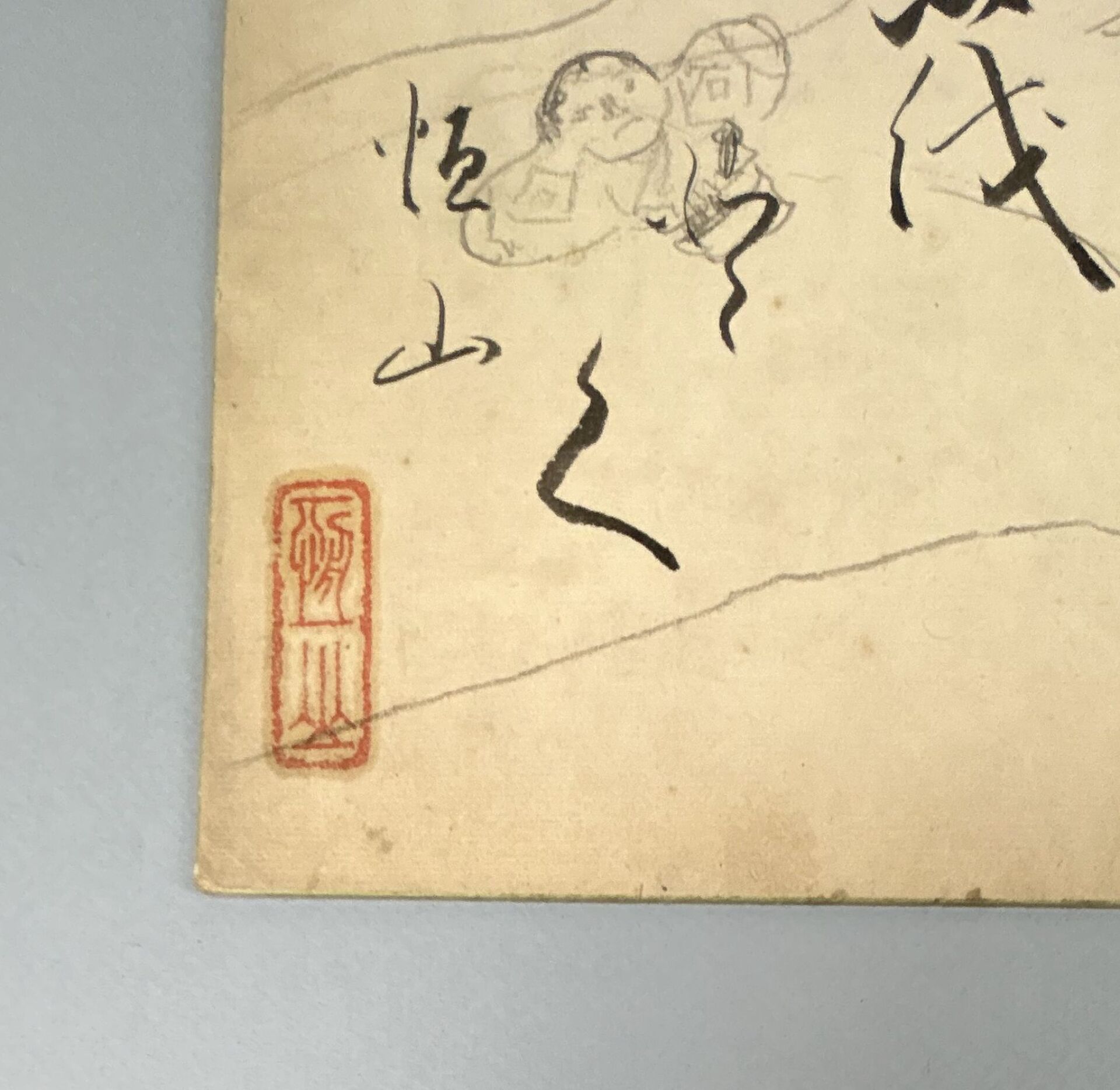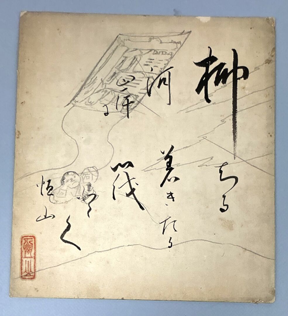 On y joint un papier contrecollé sur carton, calligraphe et crayon