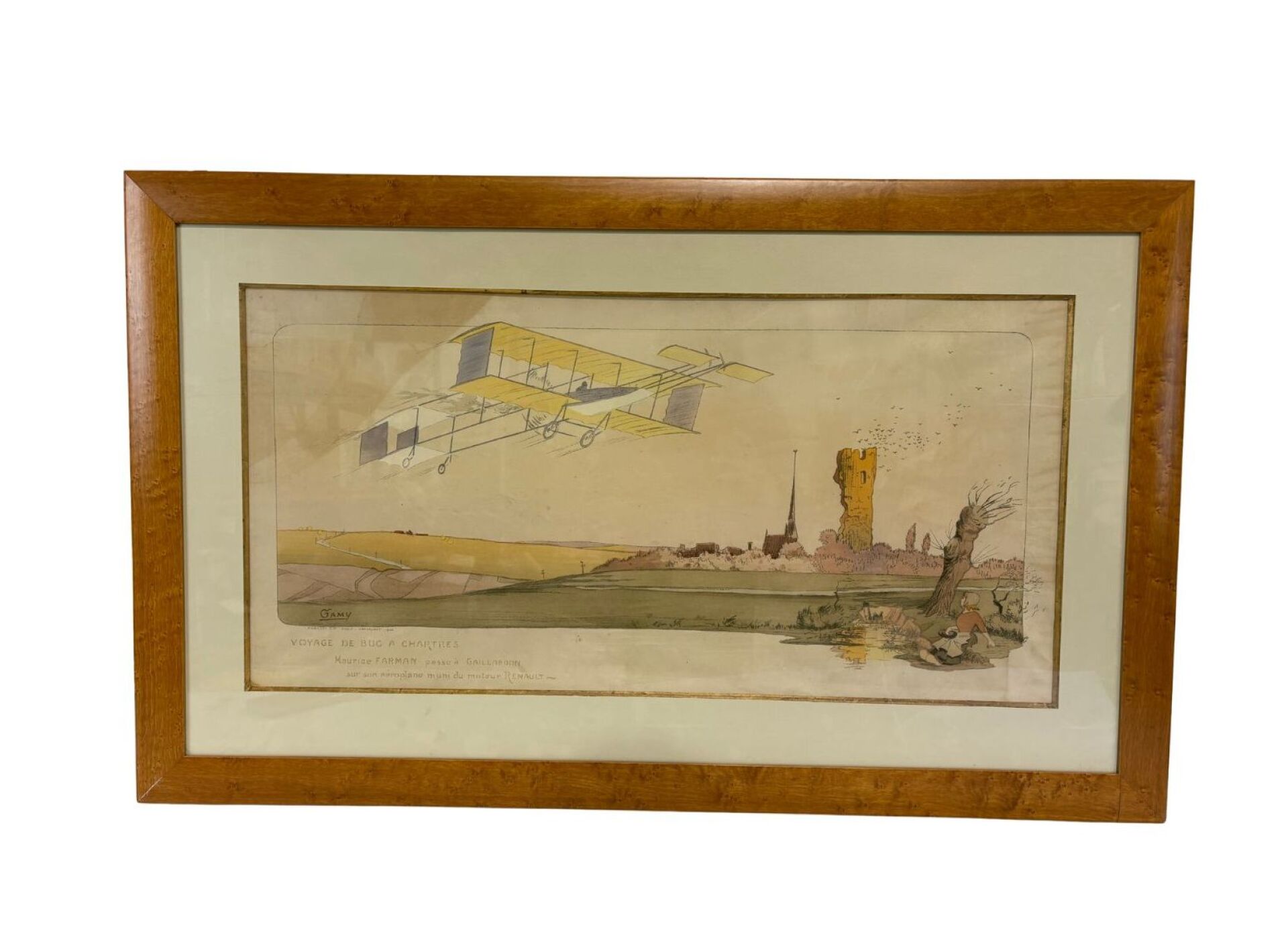 « Voyage de Buc à Chartres, Maurice Farman passe à Gaillardon sur son aéroplane muni d’un moteur Renault »