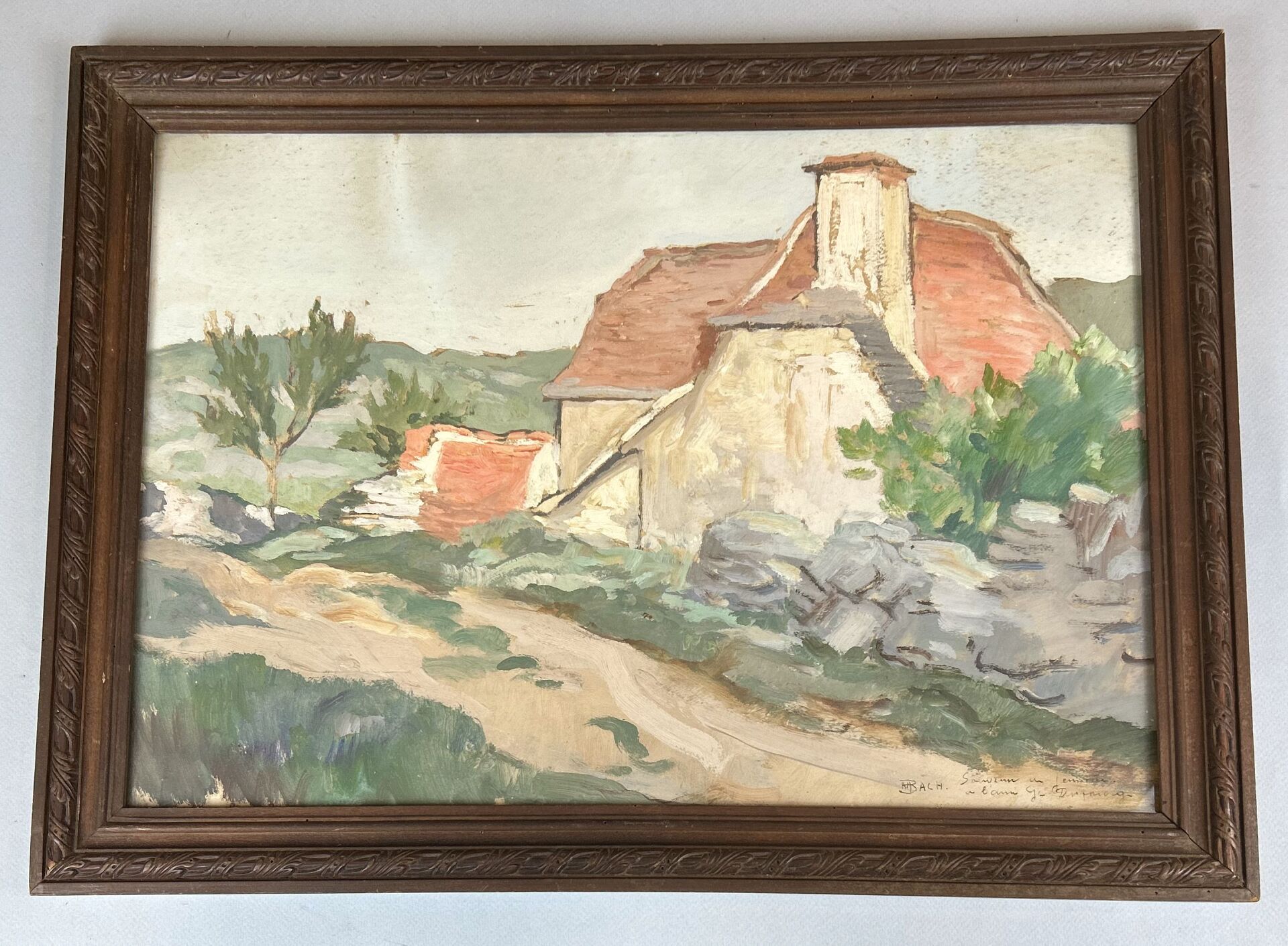 17 ESTIMATION: 50 / 80 € Marcel BACH (1879-1950) Ferme à Marcilhac-sur-Célé Huile sur papier signée en bas à droite, dédicacée « Souvenir de , à l’ami G. Dufourg » 33 x 49 cm à vue