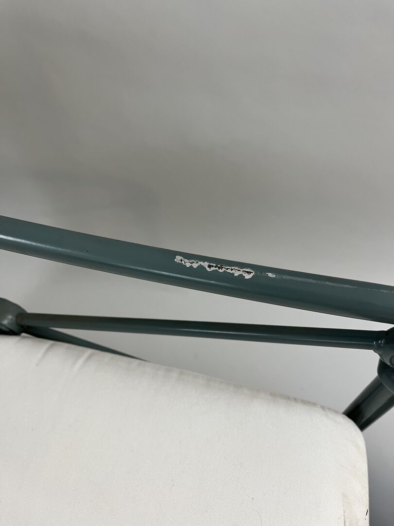 103 ESTIMATION: 200 / 300 € Madelaine CASTAING pour TECTONA Fauteuil de jardin et son ottoman, structure en métal laqué gris bleu, couverture de tissus blanc Etat d’usage, petites rayures et taches