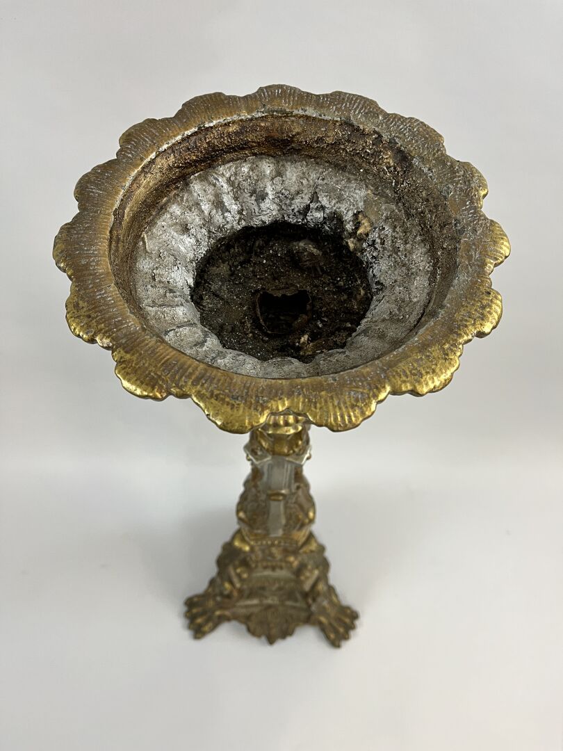 2 ESTIMATION: 100 / 200 € Important pique cierge en bronze peint, le fût très richement orné d’angelots, bouquets de fleurs, figures christiques, se terminant par trois pâtes de lions Travail XIX° Restaurations H : 101 cm