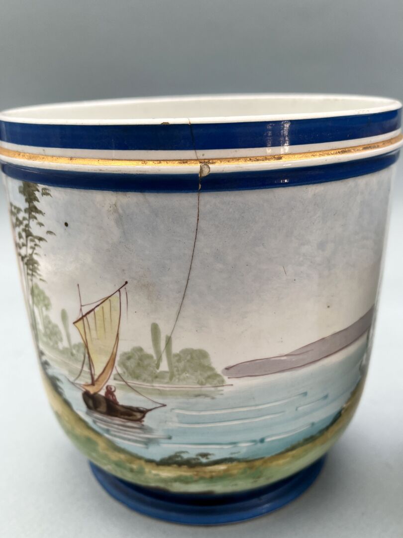 27 ESTIMATION: 50 / 80 € Paire de cache pots en porcelaine à décor de paysages lacustres Travail XIX° H : 15 – D : 15 cm Fèl sur l’un des pots