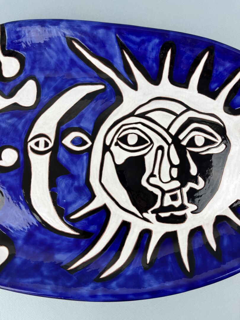 72 ESTIMATION: 1200 / 1500 € Jean Lurçat (1892-1966) et atelier Sant-Vicens Grand plat Soleil et Lune en terre cuite émaillée bleu, noir et blanc Inscriptions au dos : » Dessin J. Lurcat Saint-Vicens C – B 29/50 » 55 x 36.5 cm