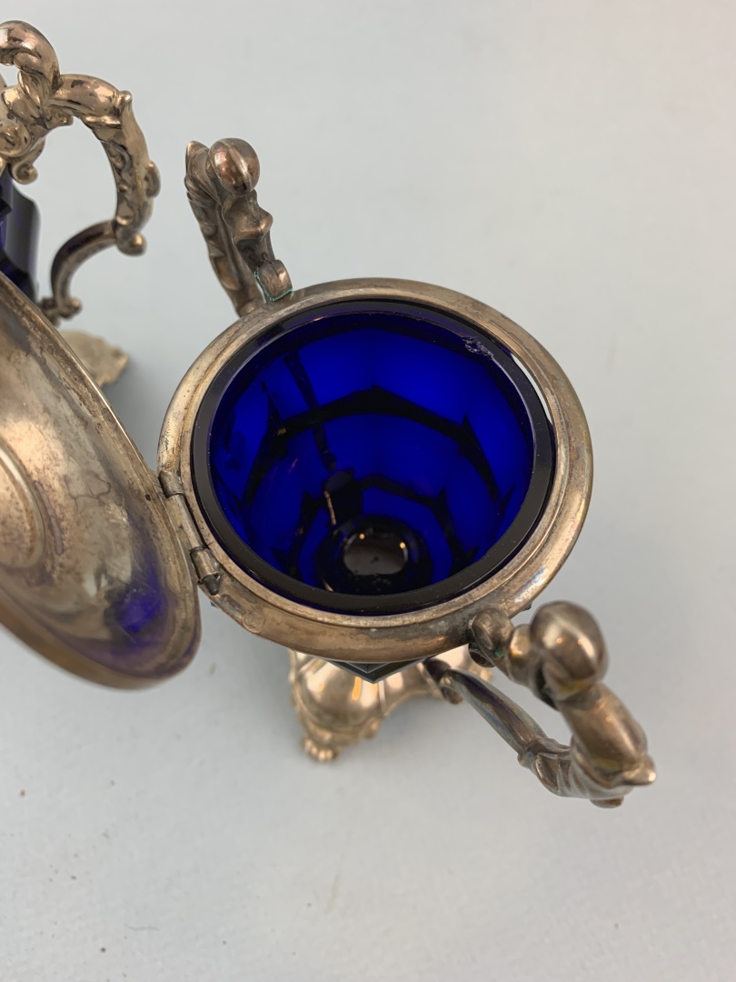 106 ESTIMATION: 150 / 200 € Paire de moutardiers en argent, poinçon minerve, montés sur socle reposant sur quatre pieds à enroulements. Garniture en verre bleu à pans coupés, anses à décor de volutes rocaille. Poids : 485 g brut