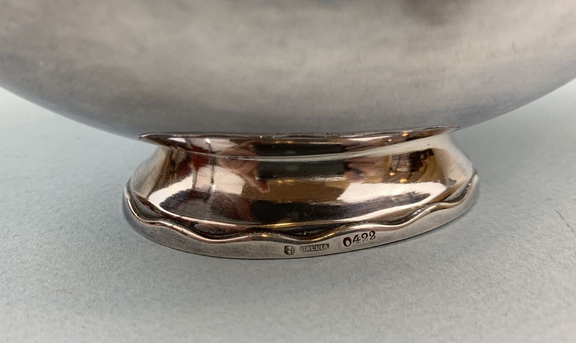 122 ESTIMATION: 150 / 200 € Christian FJERDINGSTAD (1891-1968) pour CHRISTOFLE, Collection GALLIA, Saucière CYGNE sur piédouche à décor de vaguelettes et sa cuillère dont le manche figure une tête de cygne en métal argenté Travail circa 1960,