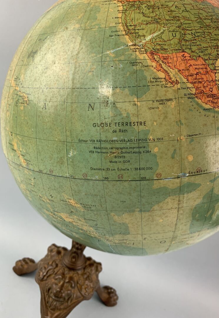 136 RÉSULTAT: 200 € ESTIMATION: 200 / 300 € Globe Terrestre de Räth Editeur VEB RATHGLOBENVERLAG LEIPZIG VLN 1003 Diam : 33 cm Monté sur un pied en fonte tripode à gueules et pattes de lion, rayures et petits chocs H : 59 cm.
