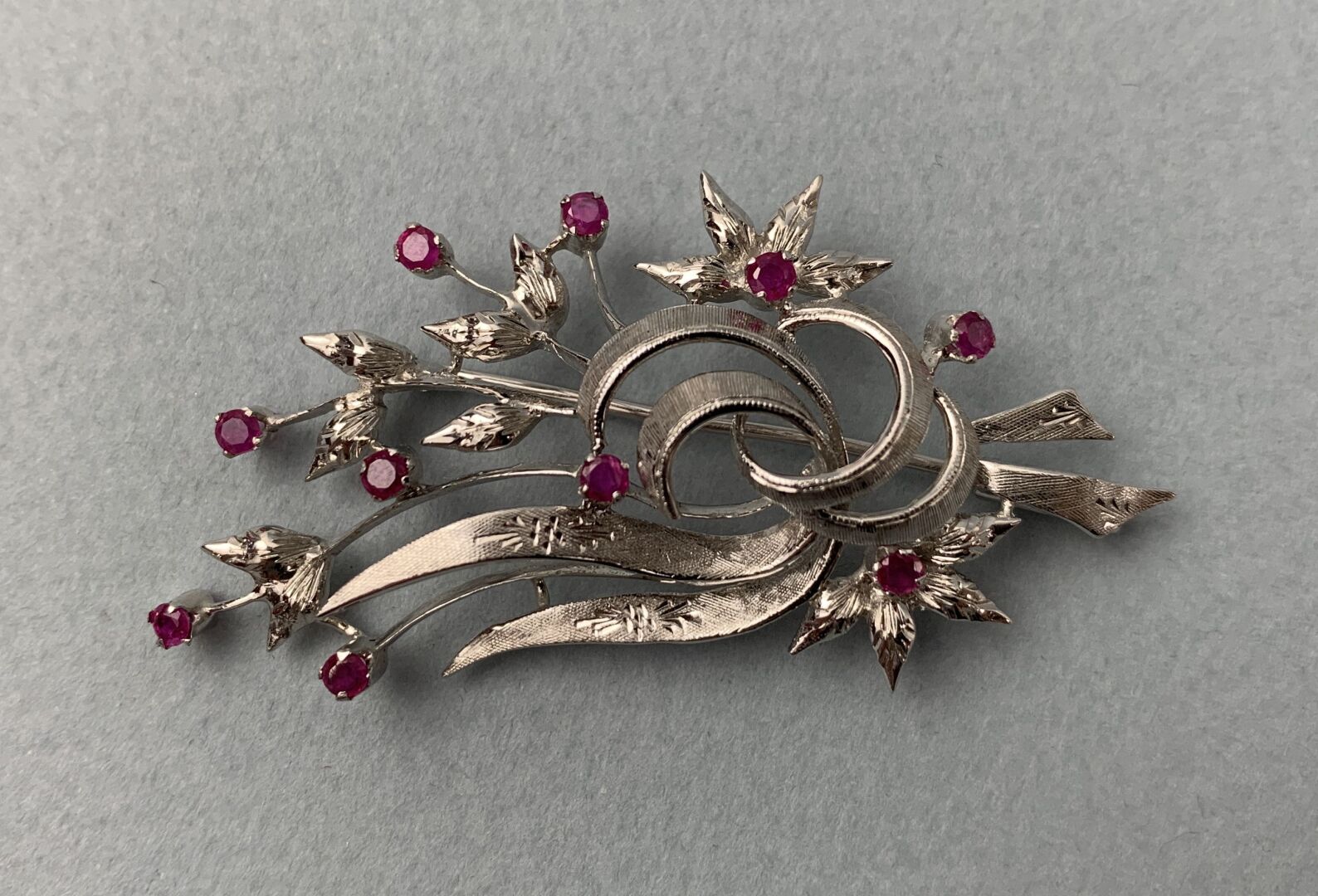28 RÉSULTAT: 300 € ESTIMATION: 250 / 300 € Broche feuillagée en or gris (750 millièmes) sertissant dix petites pierres roses (probablement saphir) Travail italien, XX° siècle L : 5,7 cm Poids brut : 10,4 g