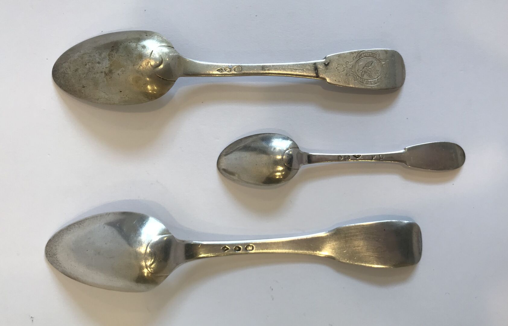 Ensemble de pièces en argent premier coq (1789-1809) comprenant une cuillère modèle uniplat Paris, maitre orfèvre LAD, la spatule gravée d’un oiseau couronné au soleil dans un macaron sommé d’une couronne comtale, une cuillère modèle uniplat province (33), maitre orfèvre illisible et d’une petite cuillère modèle uniplat, orfèvre illisible
