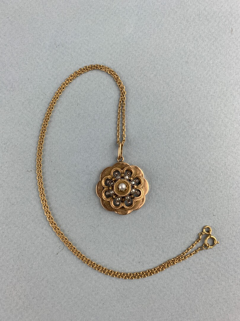 11 RÉSULTAT: 250 € ESTIMATION: 180 / 200 € Pendentif et chaine en or jaune (750 millièmes), le pendentif finement ajouré et serti de petites perles Poids brut : 7.8 g.