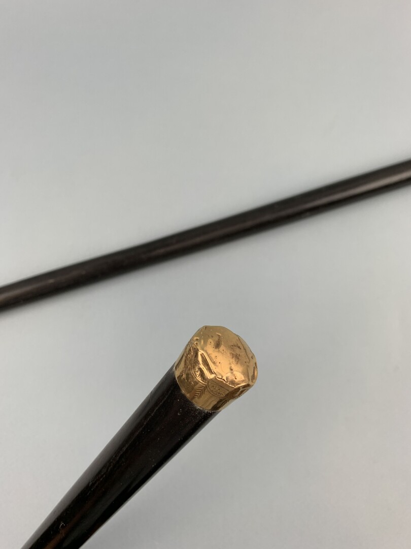 96 ESTIMATION: 80 / 120 € Deux canes en bois exotique, l’un des pommeux en or jaune (750 millièmes) poinçon tête de cheval L : 85 et 82 cm. On y joint une ombrelle