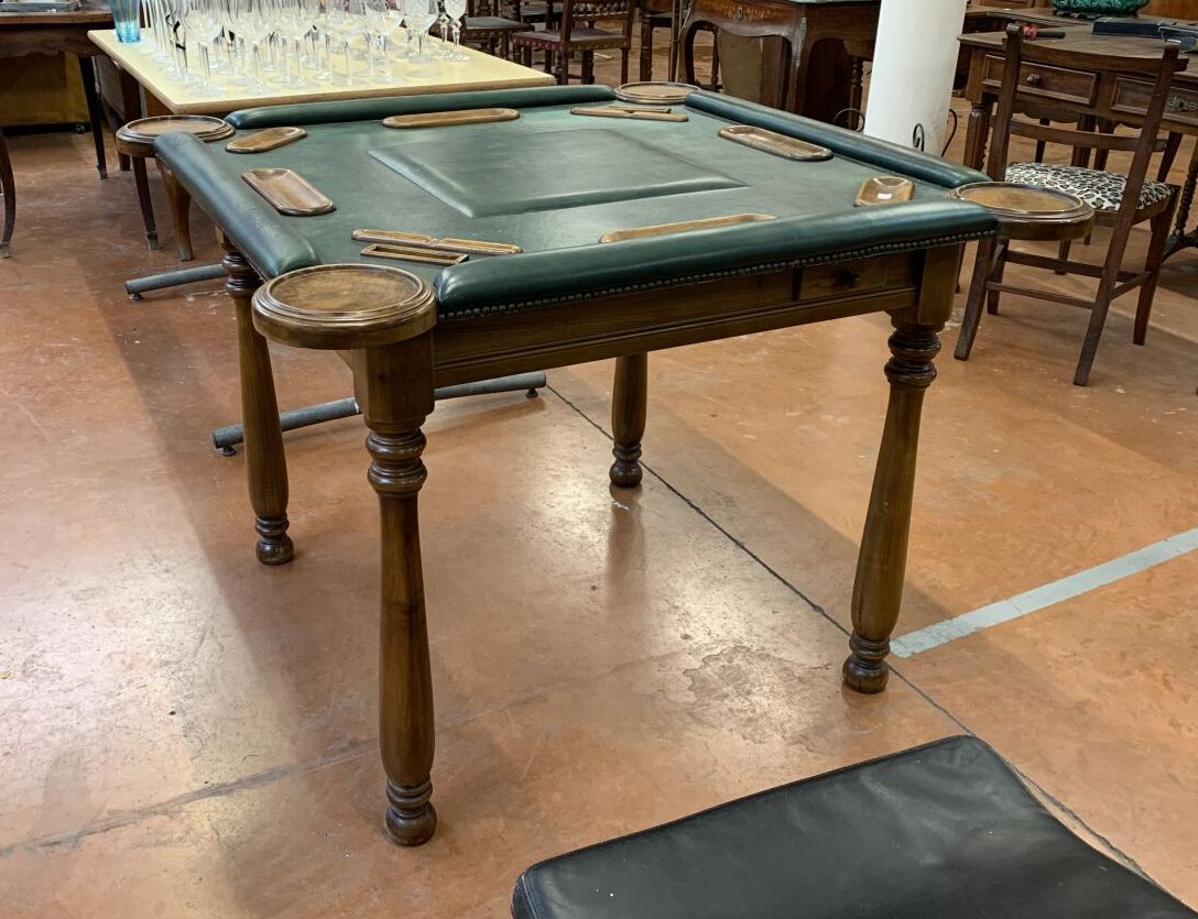 59 RÉSULTAT: 300 € ESTIMATION: 100 / 200 € Table à jeux en bois naturel garnie de cuir vert ouvrant par deux tiroirs en ceinture Important ensemble d’accessoires bois intégrés H : 80 – L : 106 cm