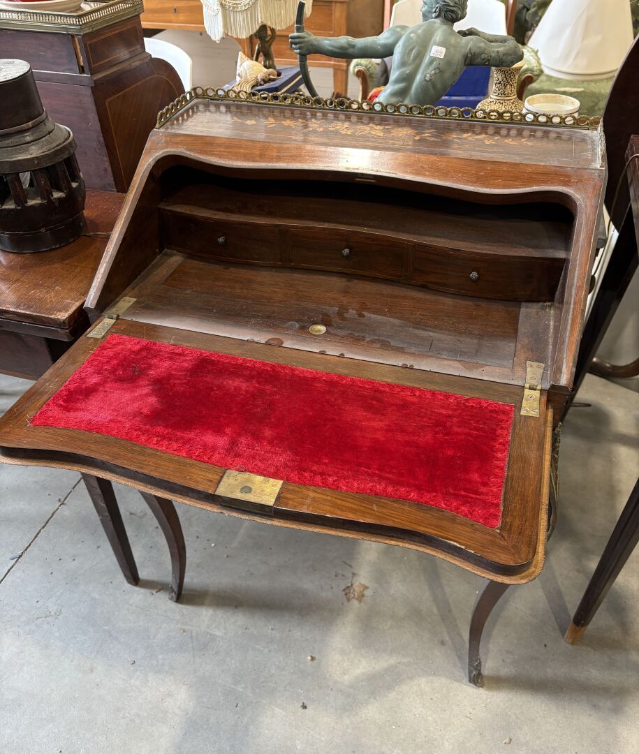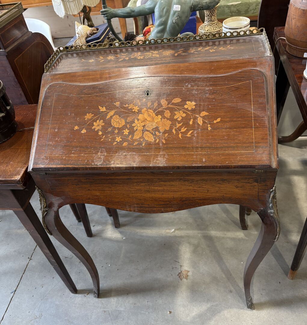 101 ESTIMATION: 50 / 80 € Secrétaire dos d’âne en bois marqueté à décor de fleurs reposant sur quatre pieds cambrés, abattant découvrant trois tiroirs Travail de style Louis XV Manques et sauts de matière H : 95 – L : 66.5 – P : 47 cm