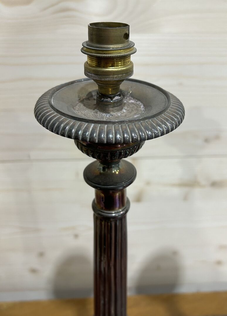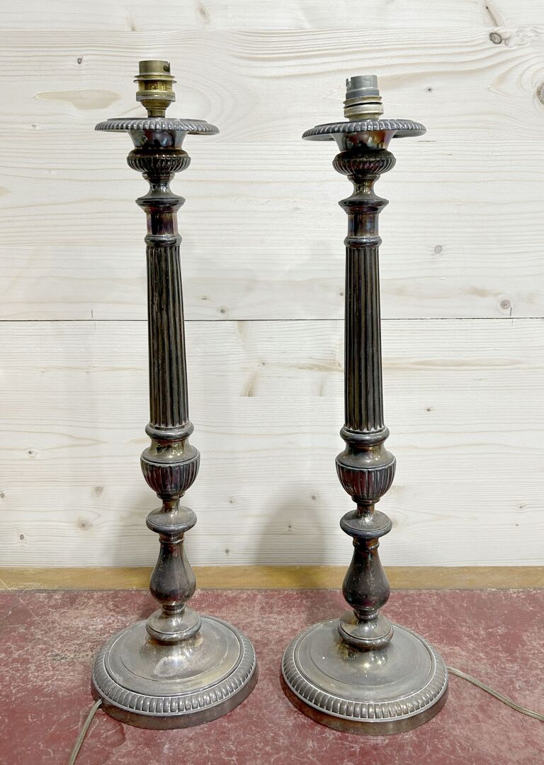 114 ESTIMATION: 40 / 60 € Paire de lampes à poser, le fût en métal argenté à décor de colonnes baguées et de godrons A nettoyer H : 55 cm