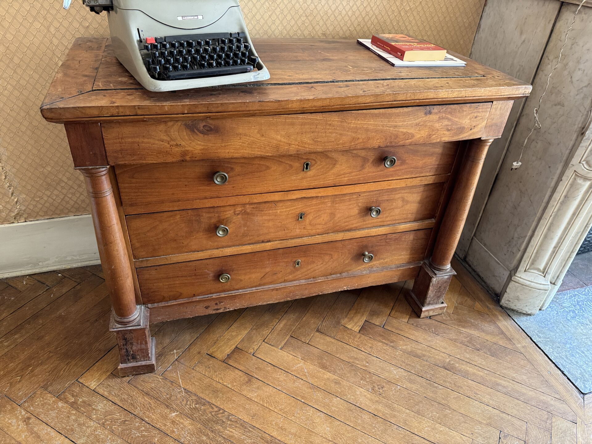 116 ESTIMATION: 80 / 120 € Commode en bois naturel à décor de colonnes dégagées, ouvrant à quatre tiroirs dont un dissimulé. Travail XIX° de style Empire H : 89 – L : 120 – P : 58 cm