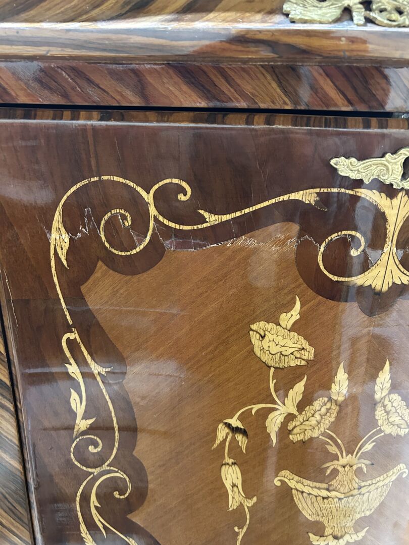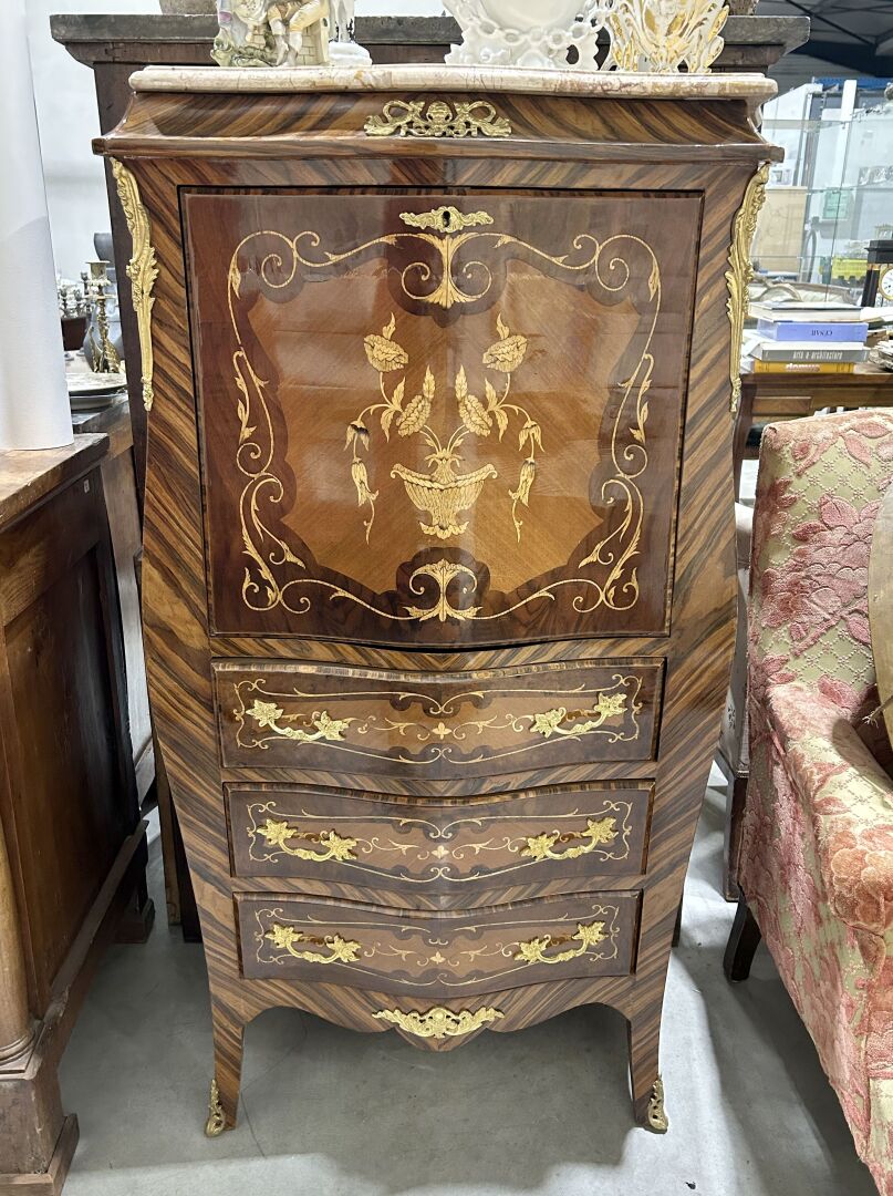 126 ESTIMATION: 100 / 150 € Secrétaire droit, galbé toutes faces, à abattant en placage de bois précieux à décor marqueté Travail de style Louis XV H : 132 – L : 80 – P : 43 cm