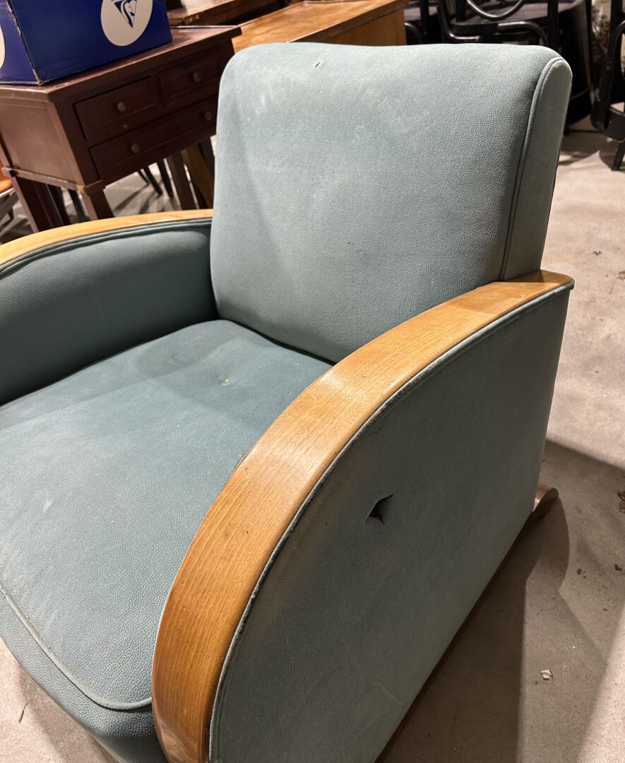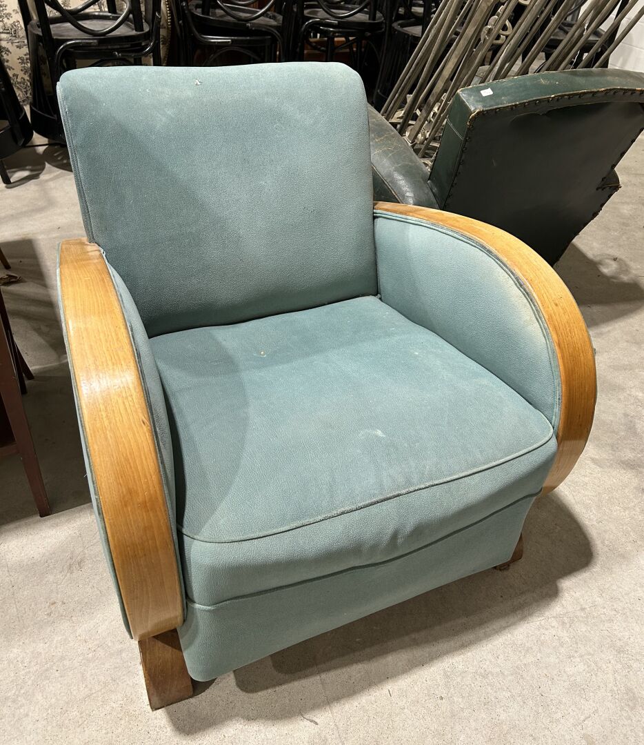 128 ESTIMATION: 40 / 60 € Fauteuil de type fauteuil club à structure en bois tendue de tissus vert d’eau Etat d’usage – tissus perforé sur le côté