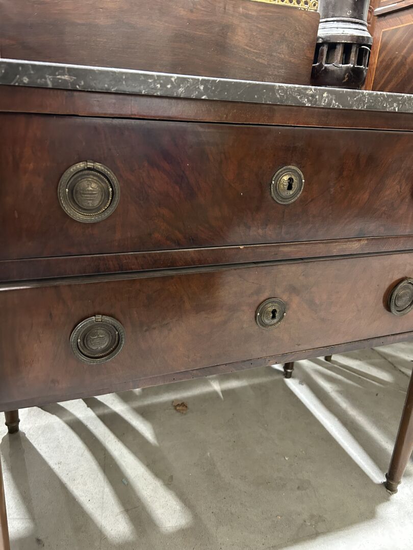 132 ESTIMATION: 50 / 80 € Commode en bois de placage de style Louis XVI, dessus de marbre gris H : 74 – L : 81 – P : 48 cm