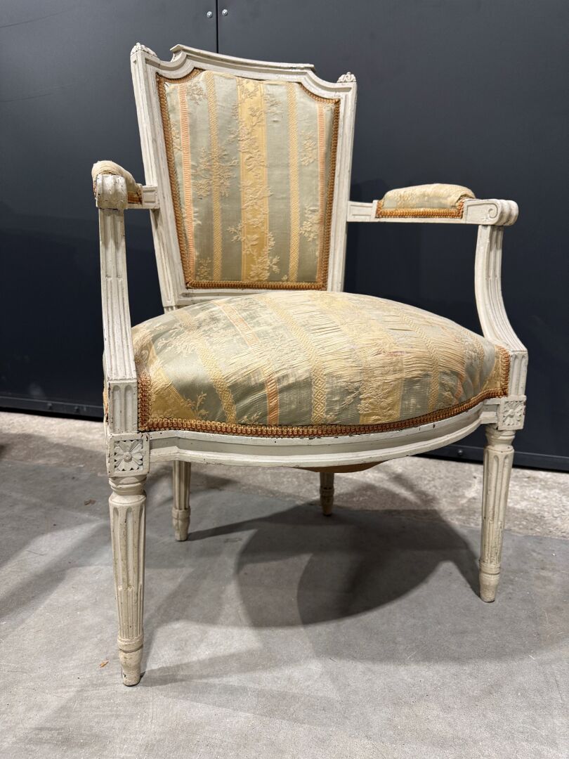 Fauteuil cabriolet en bois naturel peint blanc, mouluré et sculpté reposant sur quatre pieds cannelés, fuselés et rudentés, Travail d’époque Louis XVI
