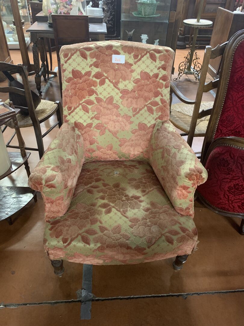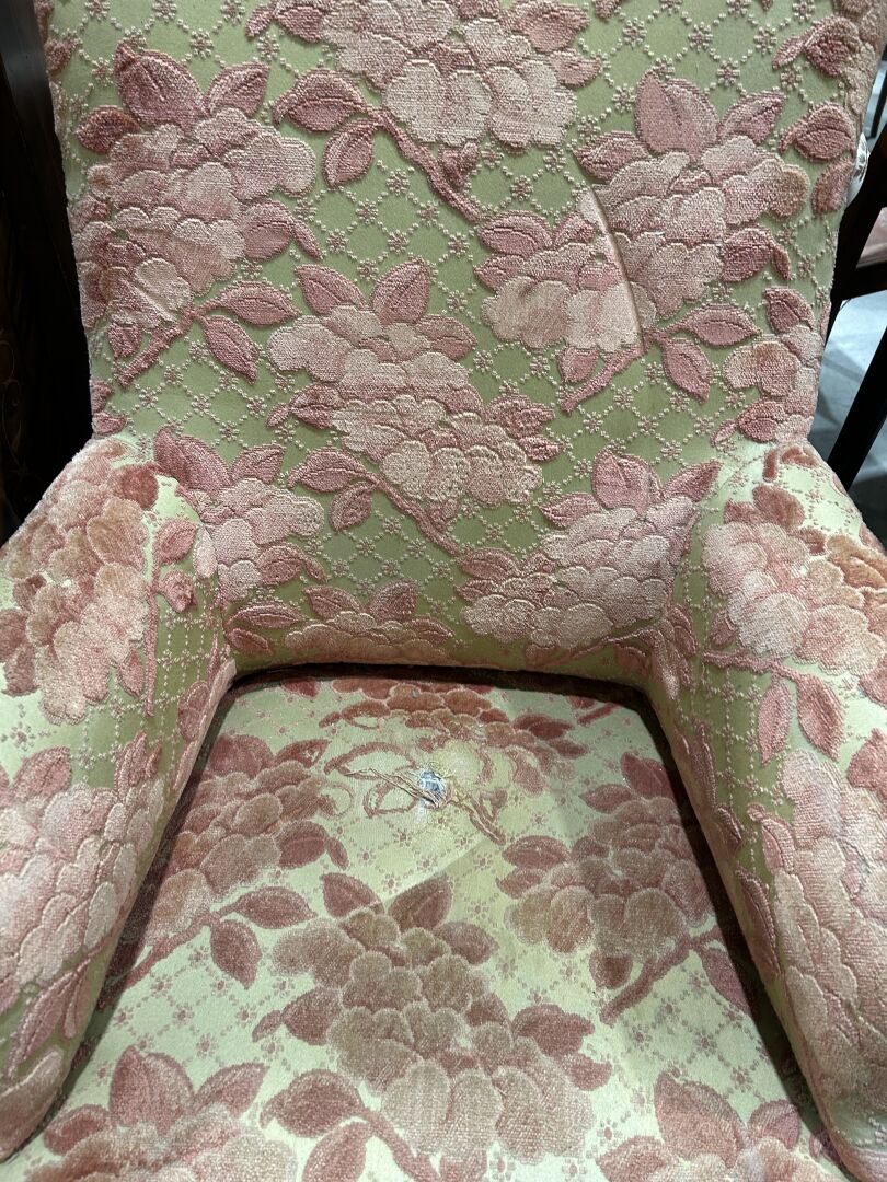 136 ESTIMATION: 30 / 50 € Fauteuil tendu de velours à décor floral sur fond jaune reposant sur quatre pieds en bois tourné Assise trouée H : 94 cm