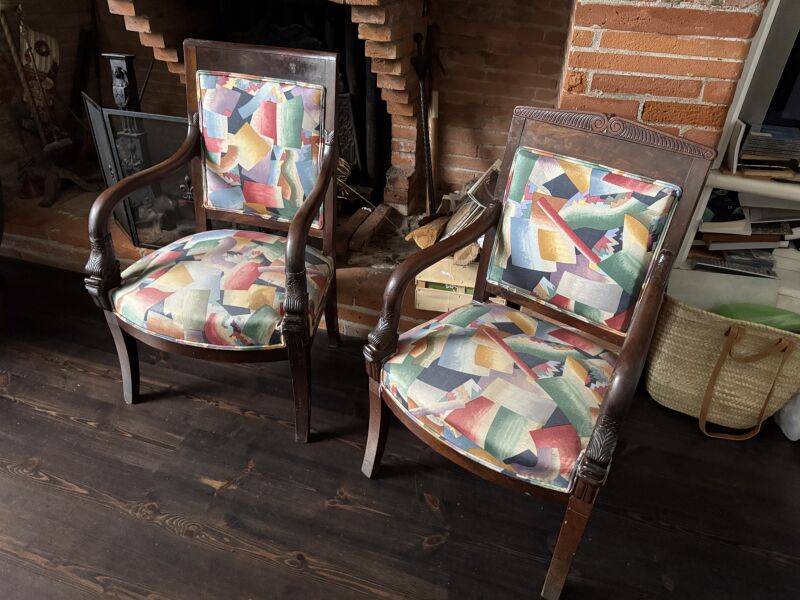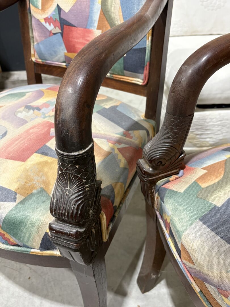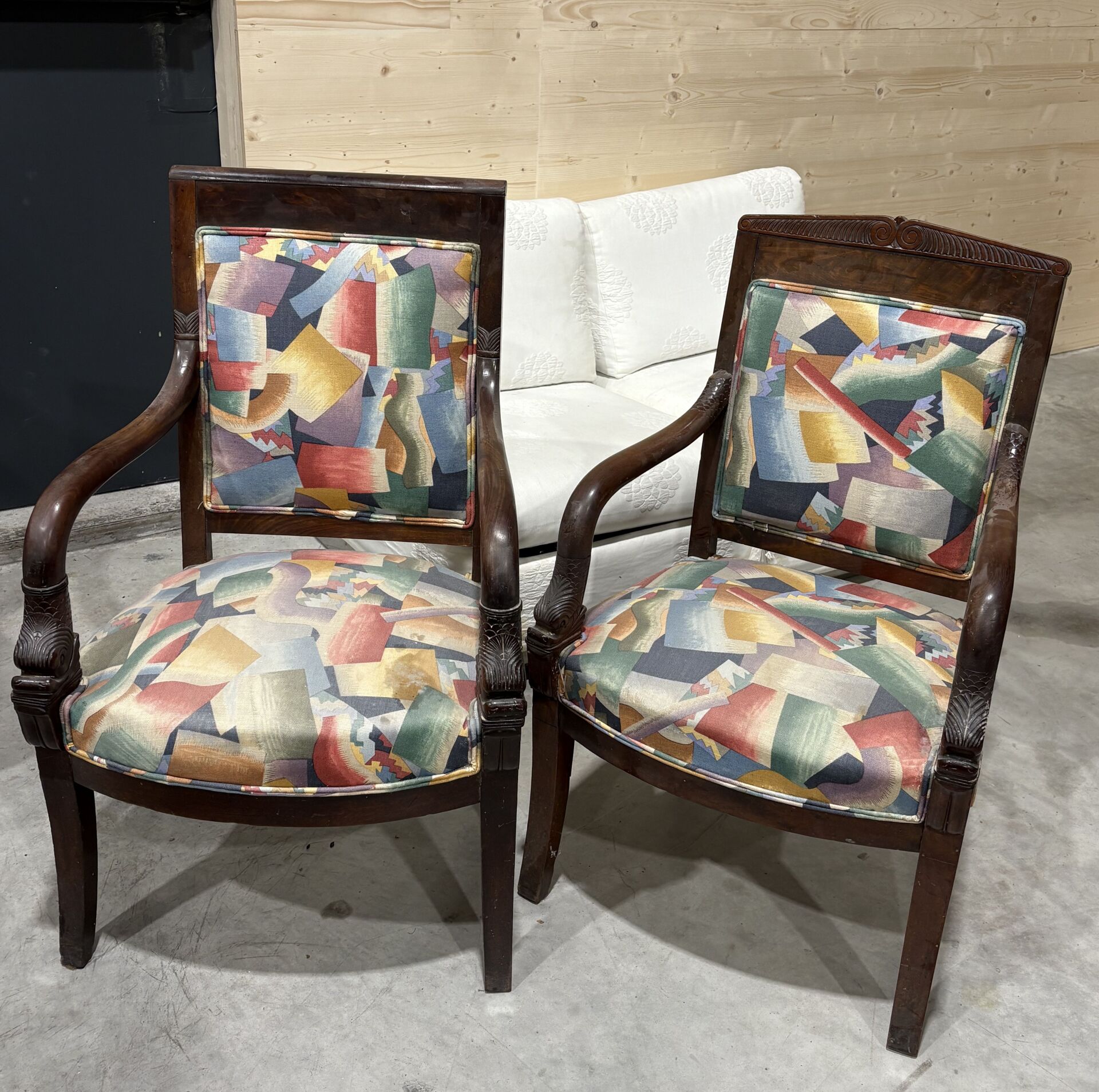 Deux fauteuils en acajou et placage d’acajou à décor de palmettes et col de cygne