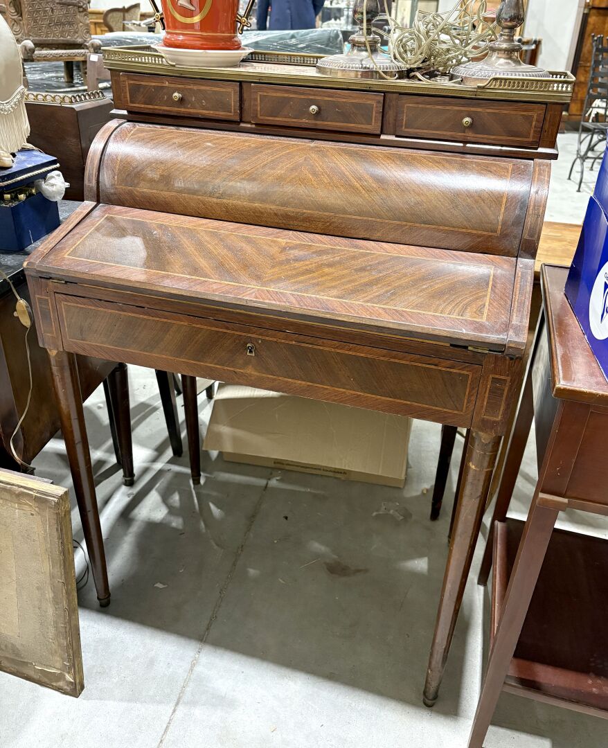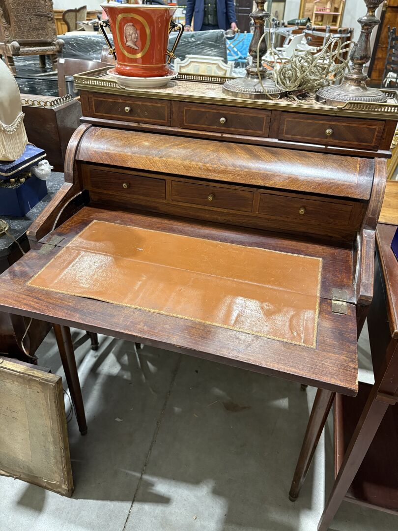Petit bureau à cylindre en placage de bois précieux, ouvrant par un cylindre, un tiroir en ceinture et trois tiroirs en gradin, gradin cerclé d’une galerie de laiton, dessus de marbre, l’ouverture du tiroir en ceinture relevant l’abattant cylindrique et supportant l’abattant du plateau, découvrant trois tiroirs internes reposant sur quatre pieds fuselés