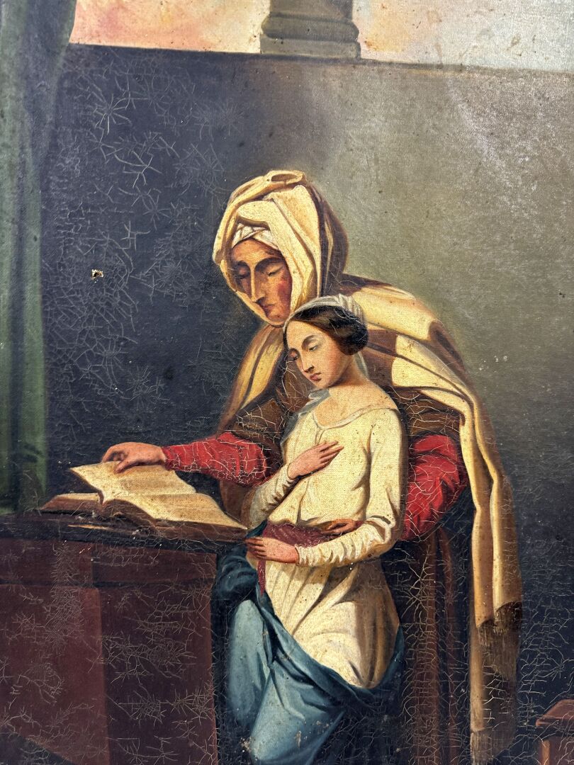 164 ESTIMATION: 50 / 80 € École française XIX° L’éducation de la Vierge Huile sur toile Accidents et restaurations 92 x 73 cm