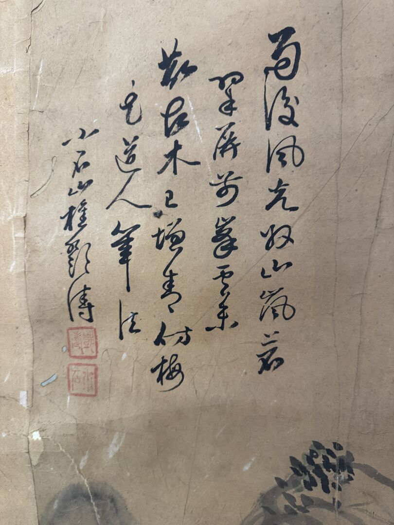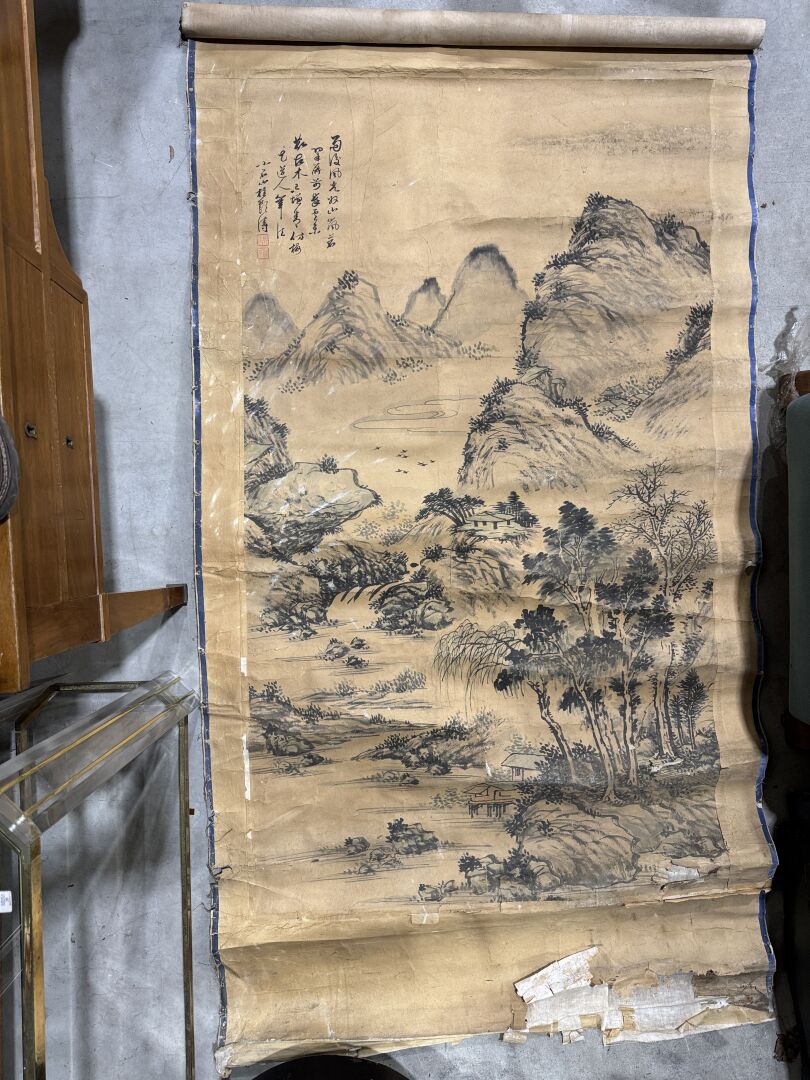Broderie sur tissus rouge à décor d’idéogrammes et peinture sur papier marouflée sur toile à décor d’un paysage et d’un poème calligraphié
