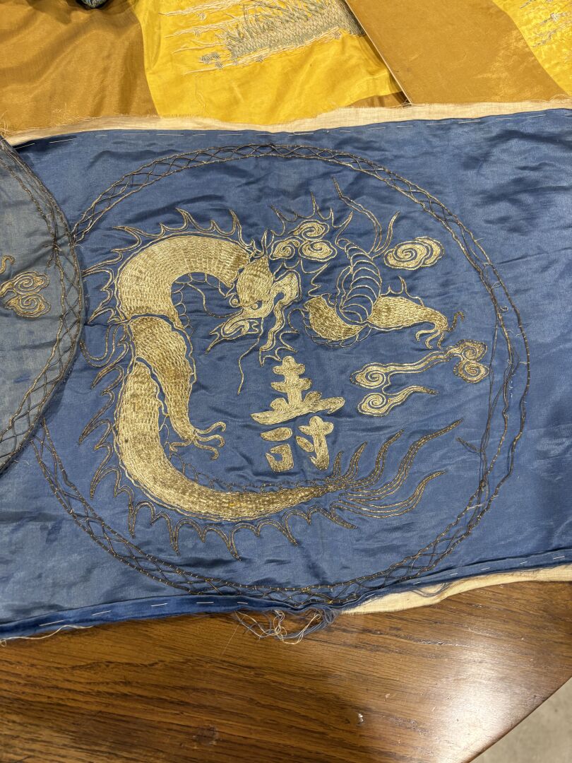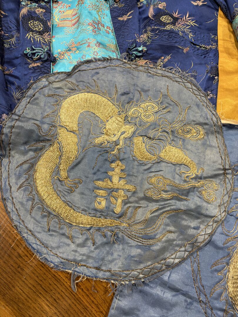 On y joint deux broderies en fil de métal sur soie bleue figurant un dragon à la poursuite de la perle sacrée entourant un idéogramme (Environ 40 cm de diamètre) et une veste moderne en tissus brodé dans le gout de l’Asie