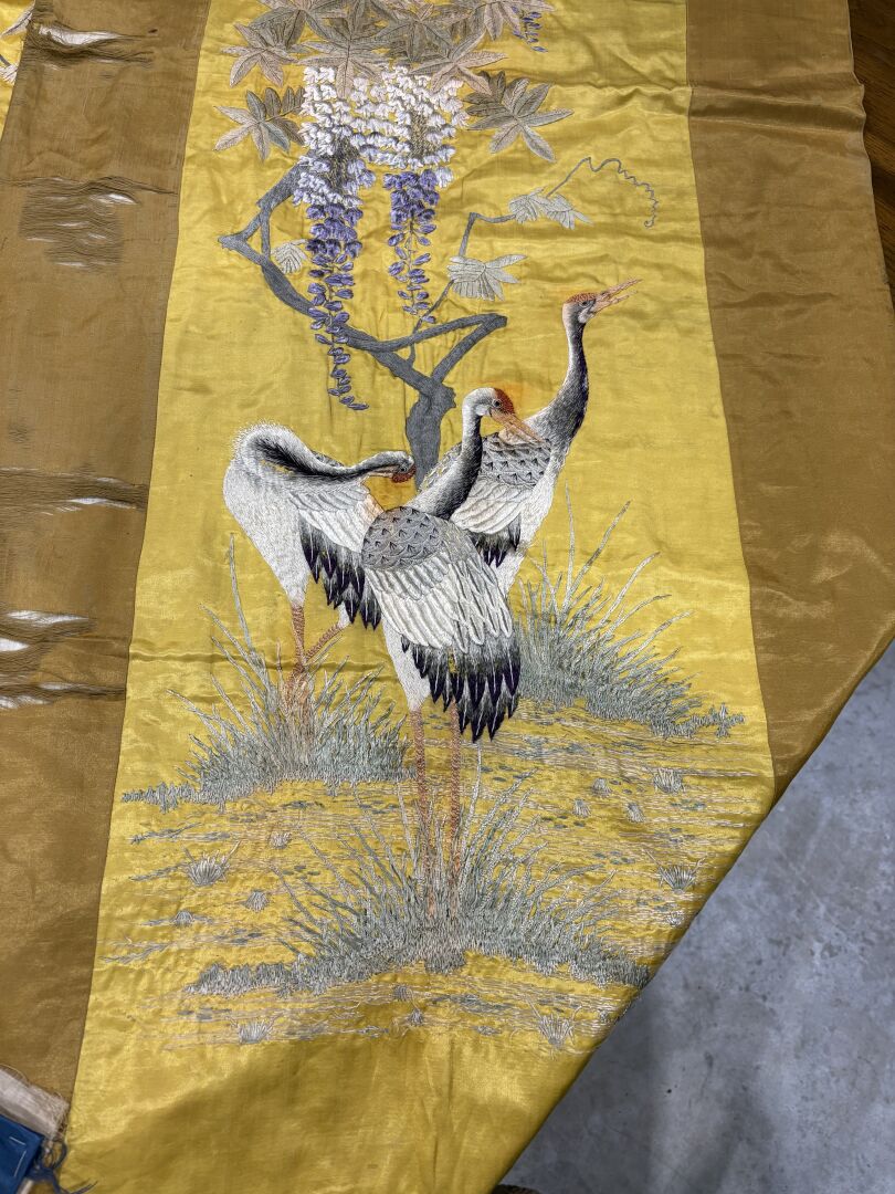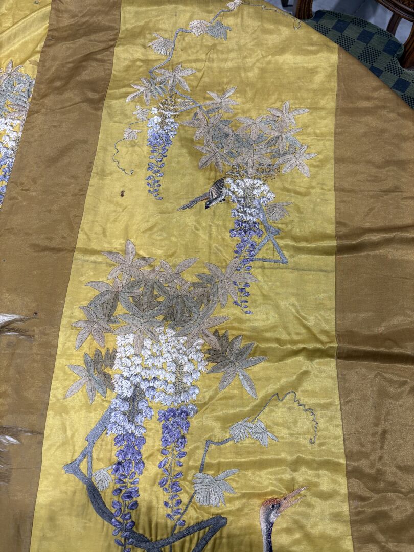 Paire de tentures de soie brodée figurant des oiseaux dans un paysage
