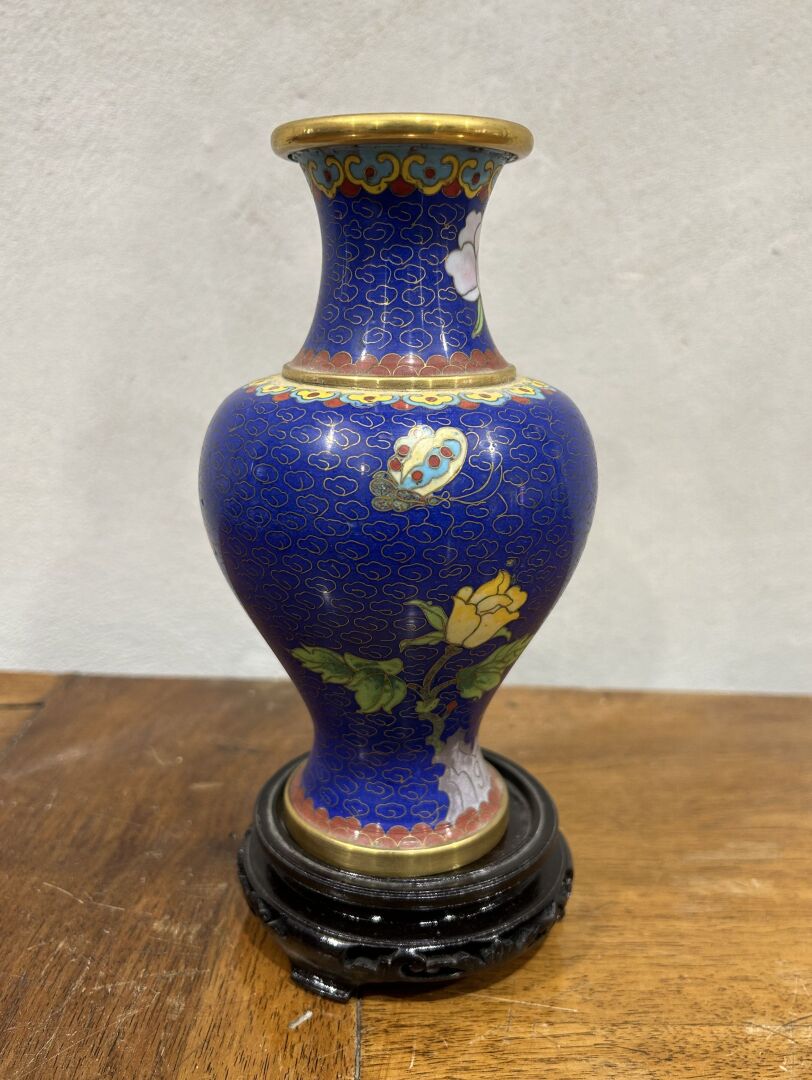 191 ESTIMATION: 20 / 30 € Vase en émail cloisonné à décor de fleurs sur fond bleu Chine XX° H : 18 cm