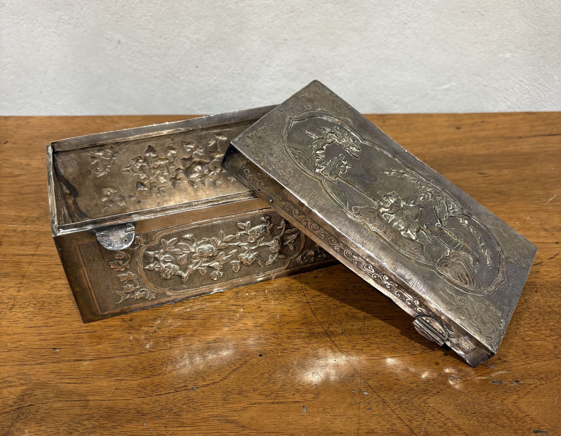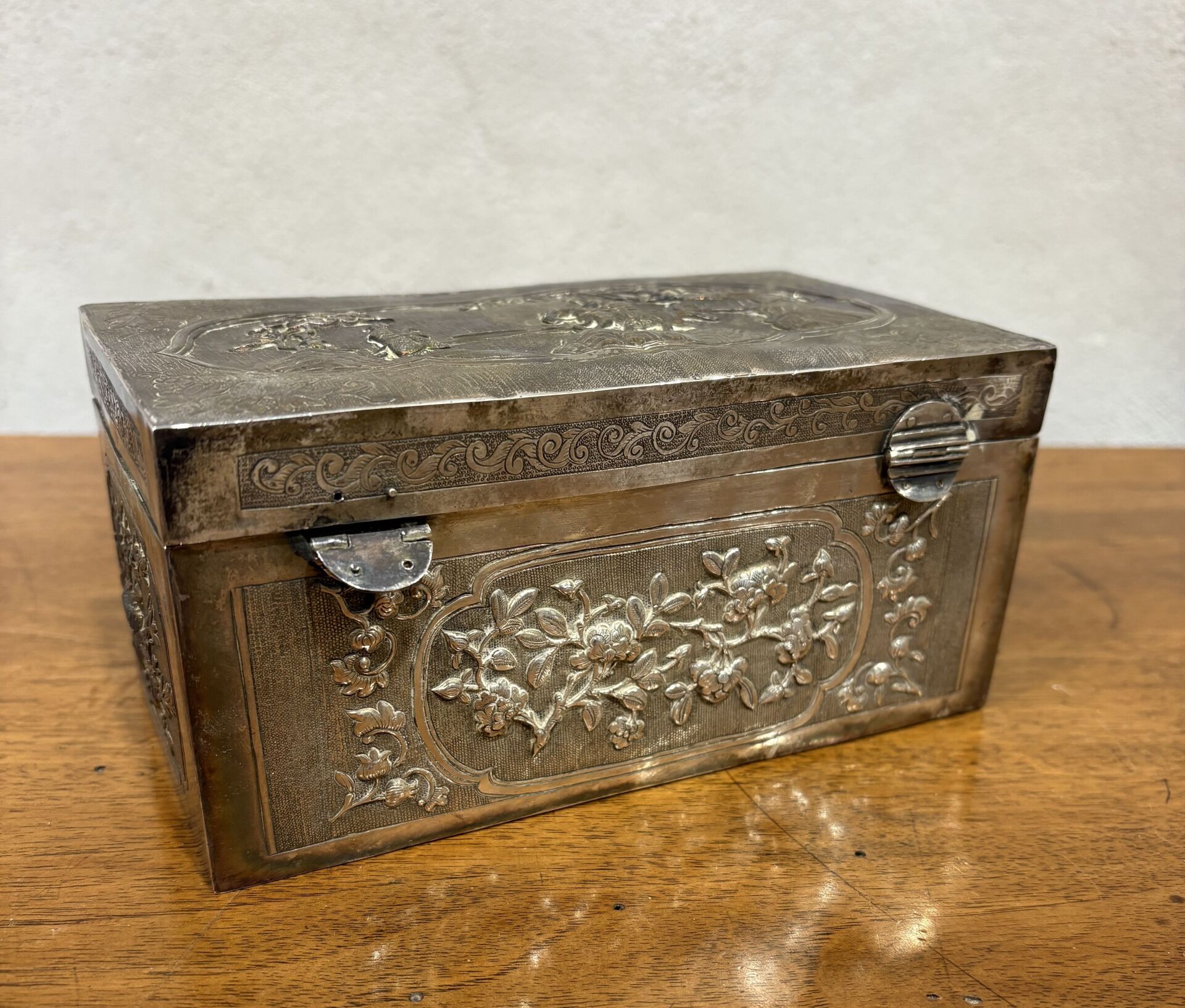 193 ESTIMATION: 200 / 300 € Boite en argent étranger à décor de scènes de vie et branchages de fleurs Travail d’Asie du Sud Est, XX° Accidents et déformations H : 8 – L : 17 – P : 9.5 cm Poids : 392 g