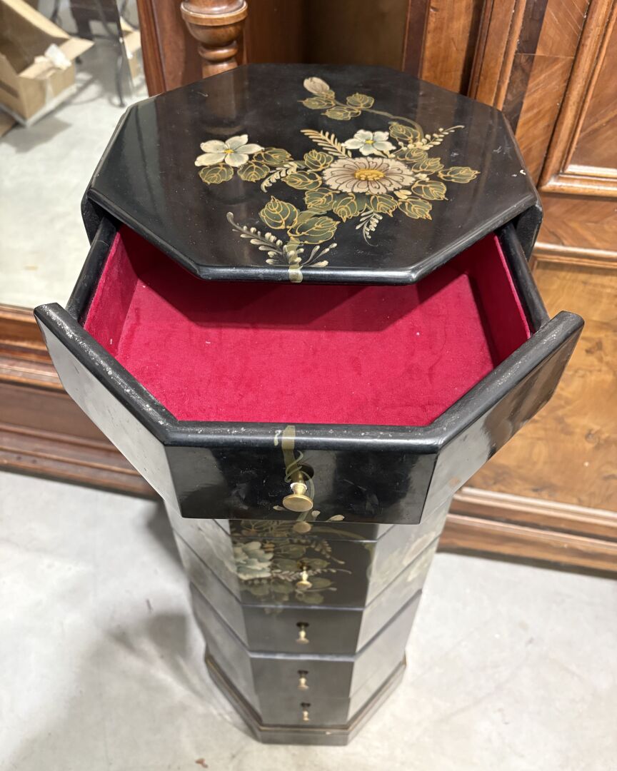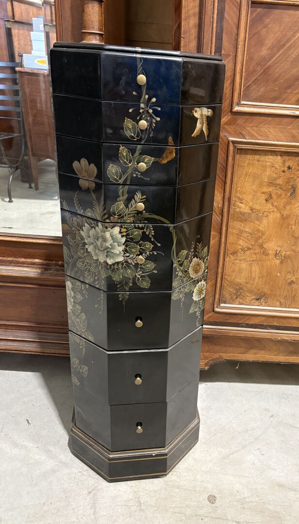 Colonne octogonale en bois laqué à décor de fleurs et d’oiseaux ouvrant à 8 tiroirs en façade