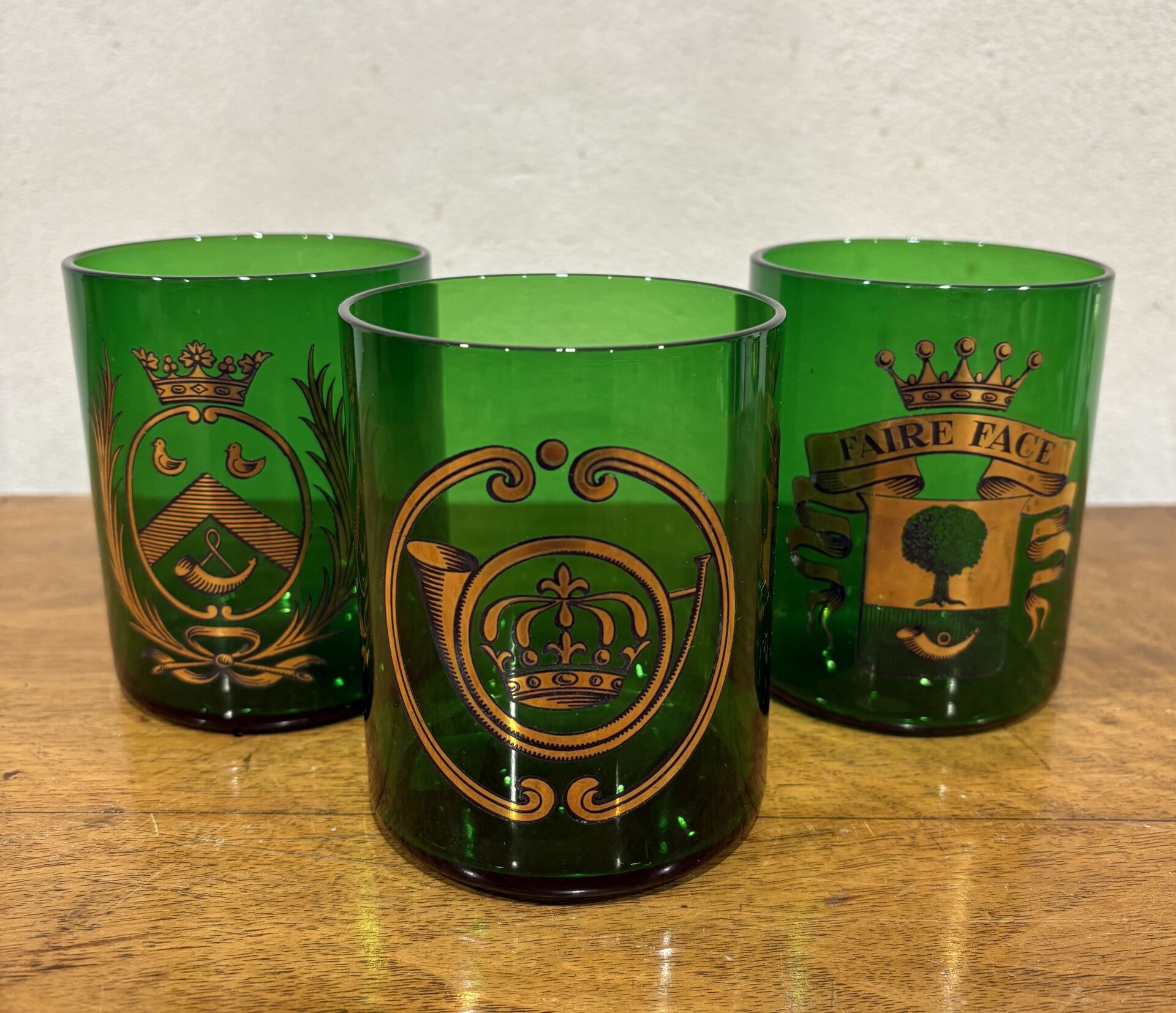 234 ESTIMATION: 10 / 20 € Suite de trois importants gobelets en verre vert à décor de blasons dorés H : 10 cm – D : 8 cm