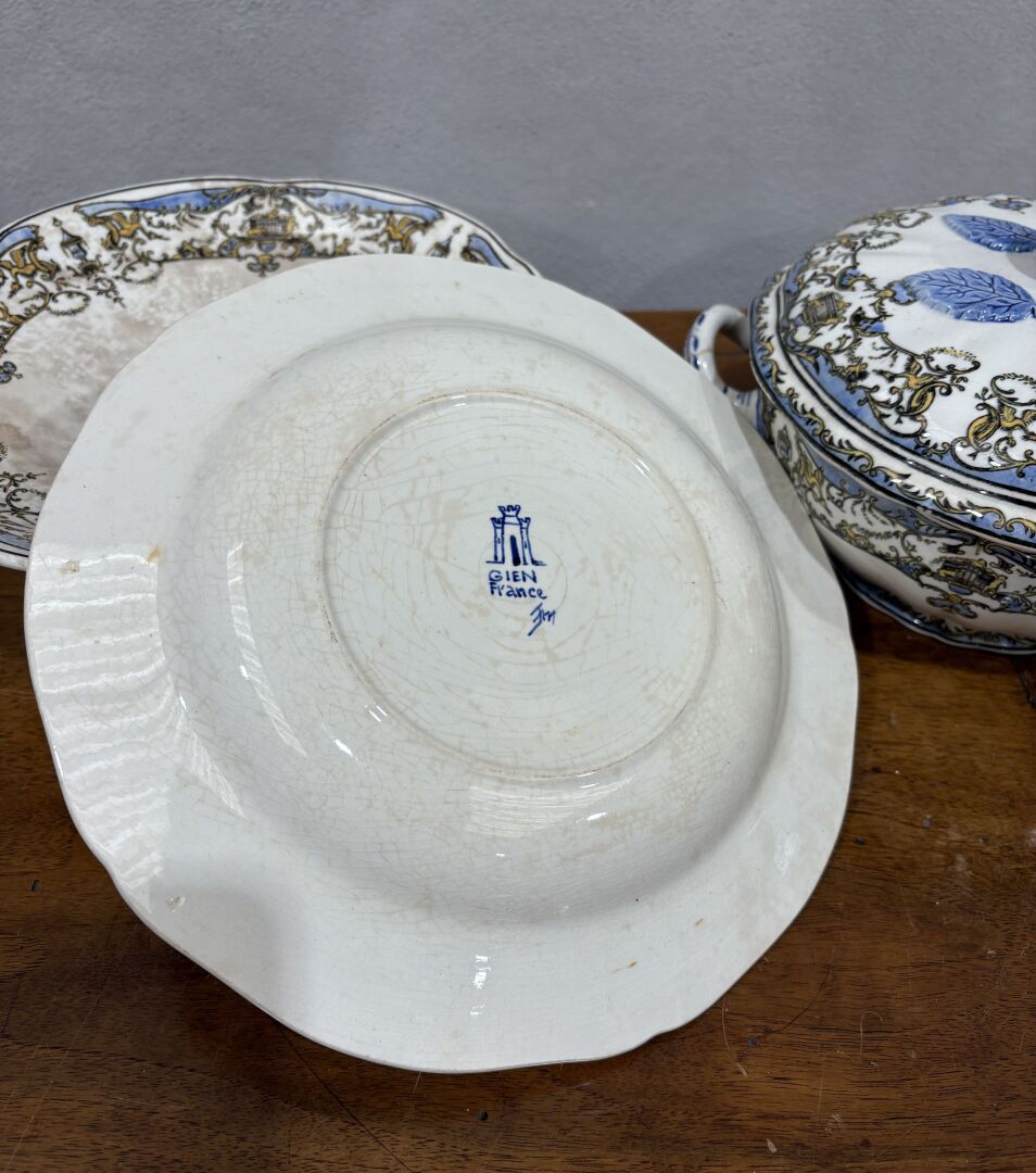 Ensemble de trois pièces de service en faïence modèle Néo-Renaissance comprenant un légumier couvert (chocs et tâches), un confiturier sur piédouche (tâches) et une assiette creuse.