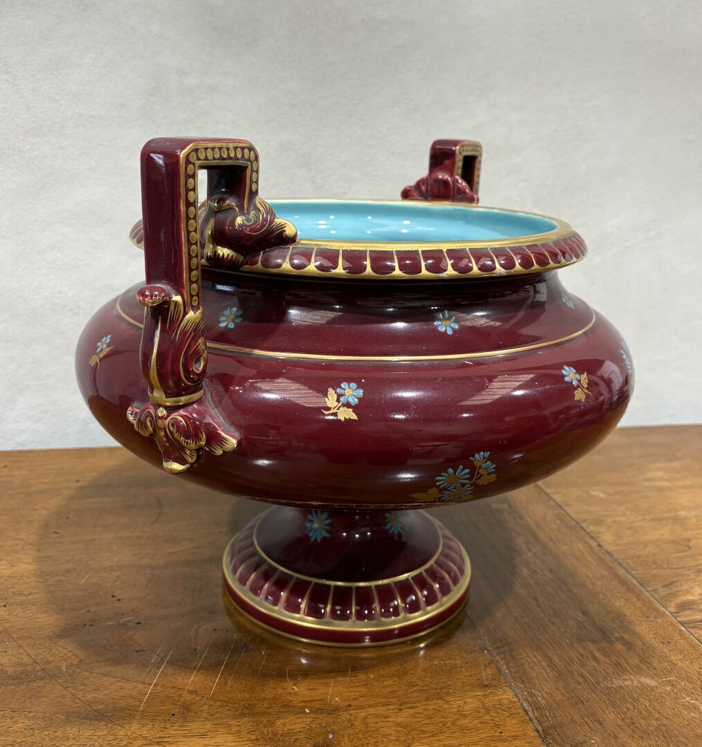 243 ESTIMATION: 50 / 80 € SARREGUEMINES Coupe sur piédouche à l’antique à décor de jeté de fleurs sur fond aubergine, intérieur bleu turquoise Petits chocs H : 30.5 – D : 41 cm avec anses