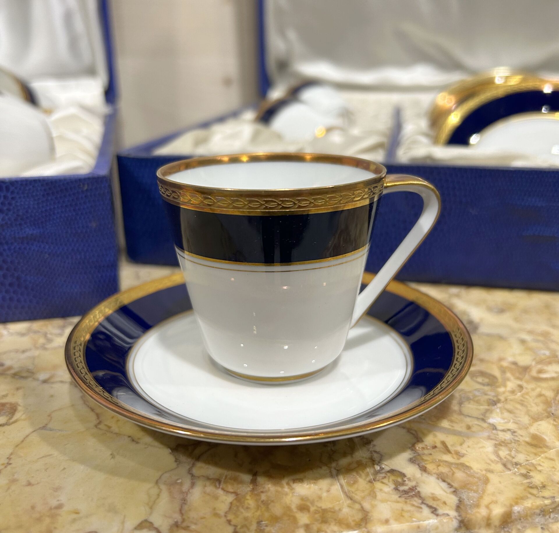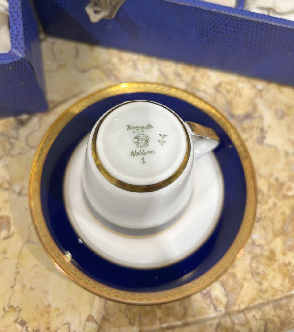 248 ESTIMATION: 30 / 50 € Hutschenreuther, Allemagne Modèle Noblesse – Suite de 12 tasses à café et leurs sous-tasses en porcelaine à décor de filets or et bleu Dans deux coffrets
