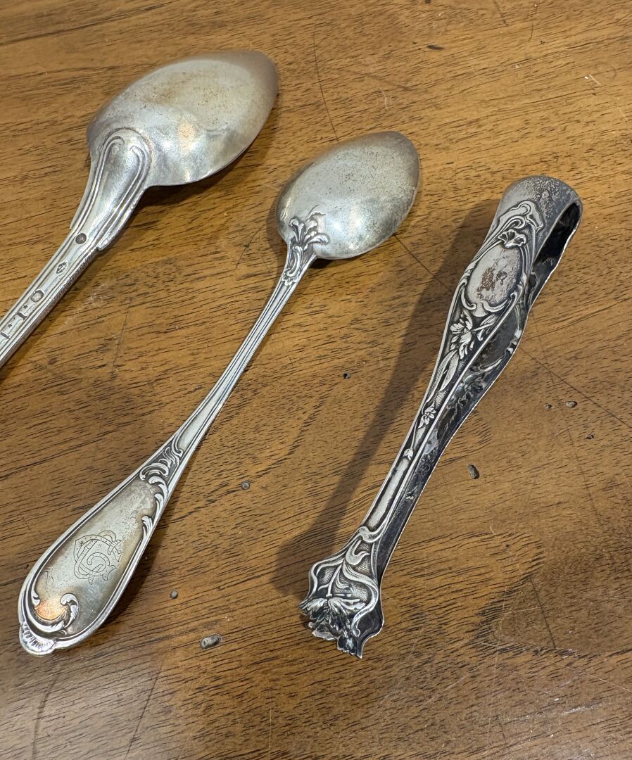 On y joint une cuillère à entremets en argent poinçon Minerve à décor Art nouveau chiffré CG et une pince à sucre en argent poinçon Minerve à décor Art Nouveau