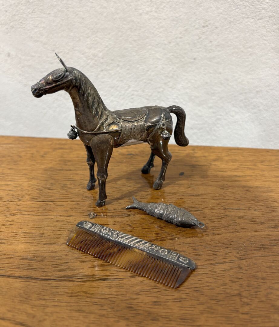 On y joint un pendentif poisson en argent articulé et un petit peigne à barbe