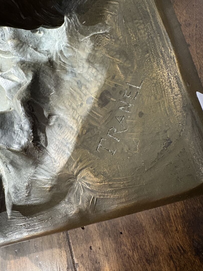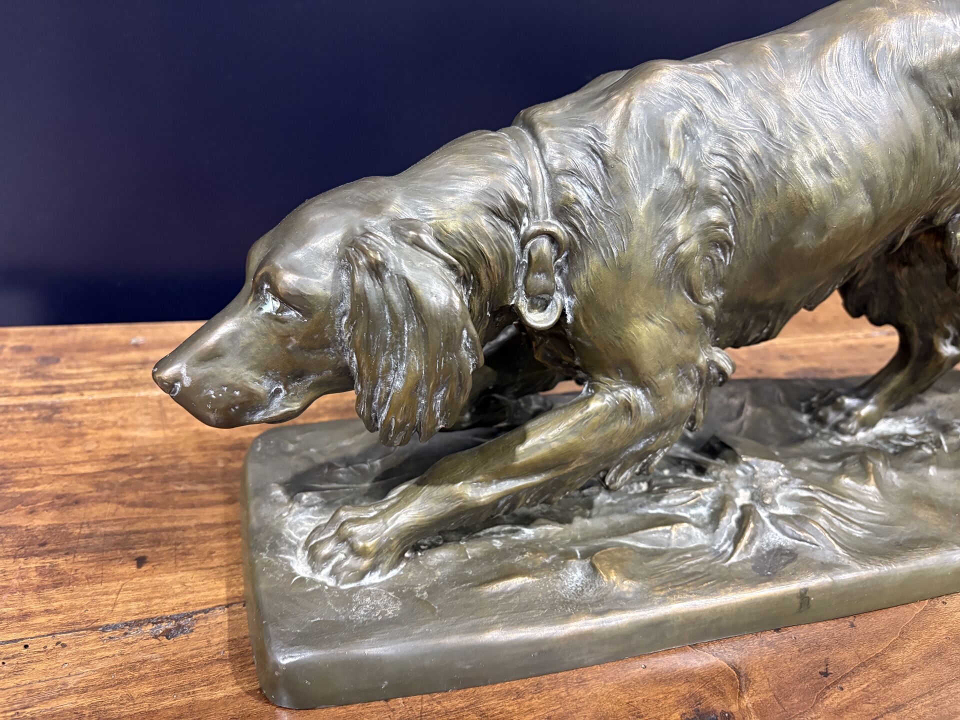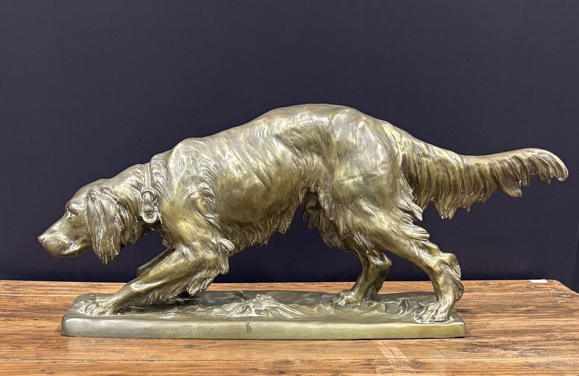 284 ESTIMATION: 50 / 80 € TRANEL, XX° Setter anglais chassant Sujet en régule à patine médaille, signé sur la terrasse L : 64 cm