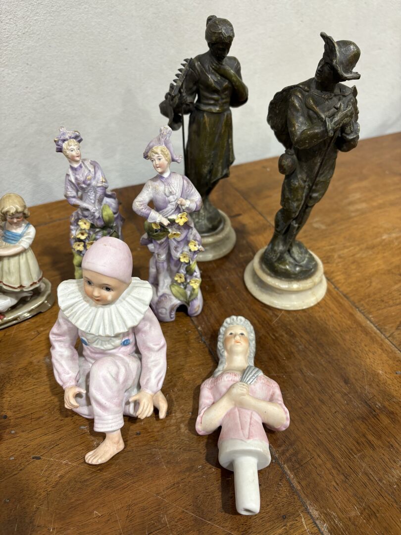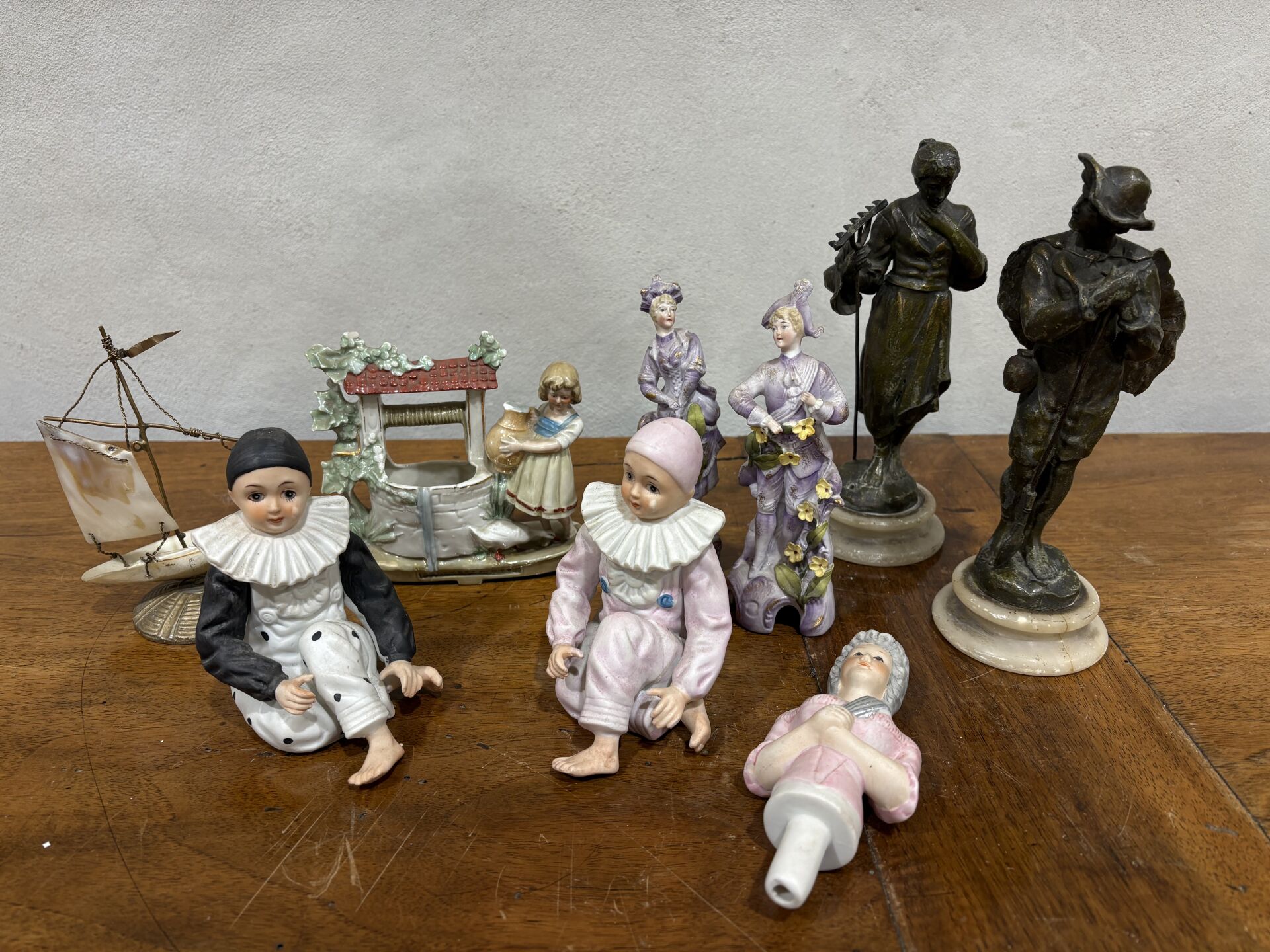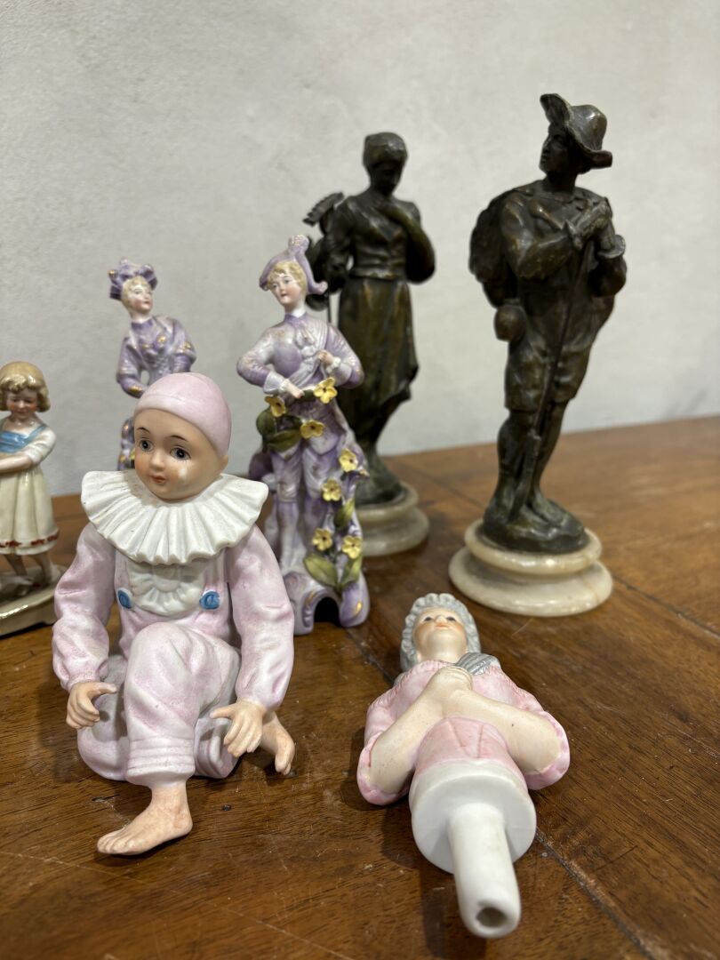 Lot comprenant deux Pierrot en biscuit (12 cm), un sujet en porcelaine figurant une jeune fille au puits (H : 12 cm – accident), couple d’élégants en biscuit (H : 15 cm), un bouchon en biscuit représentant une marquise (H : 14 cm), un couple de paysans en régule (H : 20.5 cm – accidents et manques) et un bateau en nacre et métal doré (accidents)