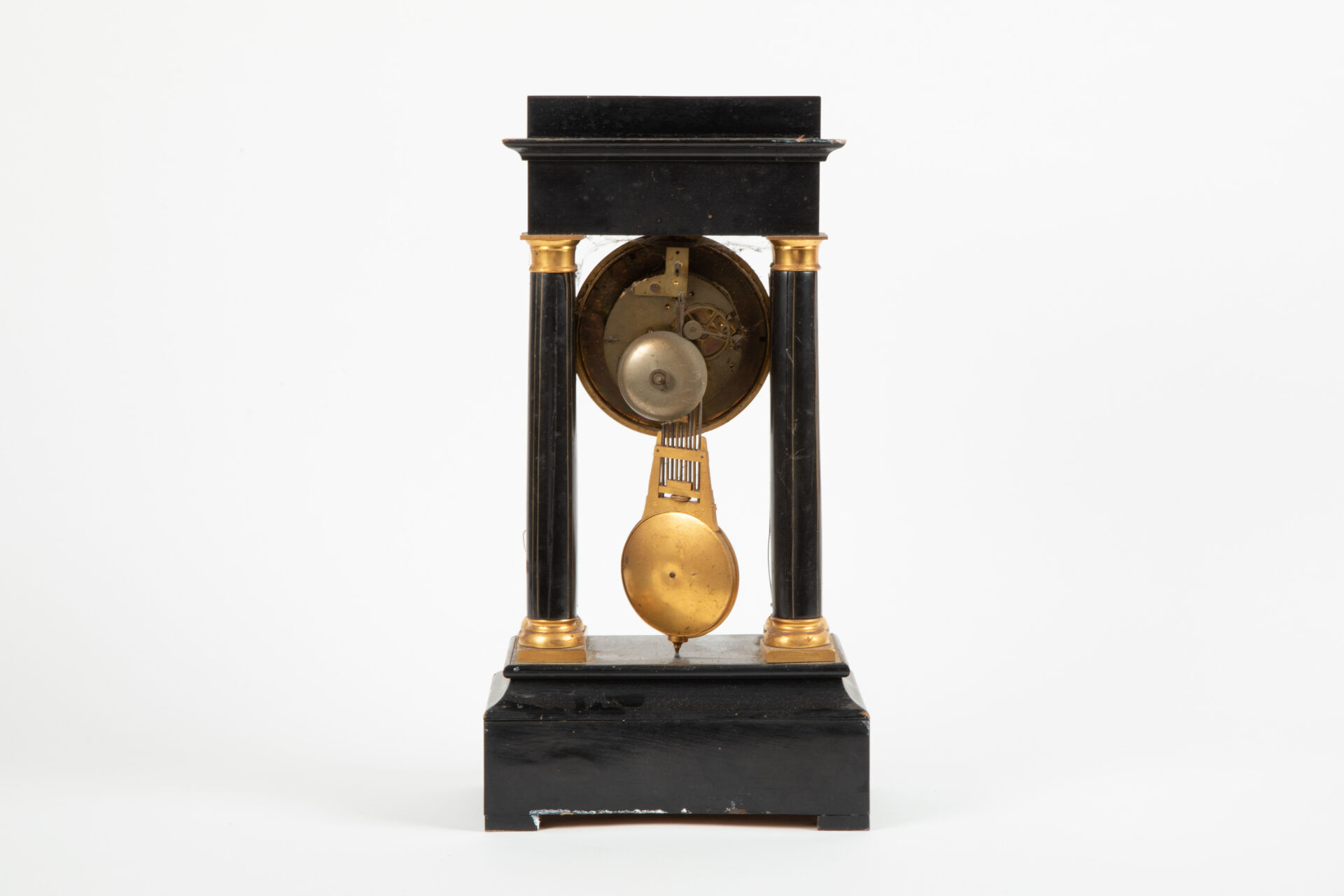 302 ESTIMATION: 50 / 80 € Pendule portique à quatre colonnes de bois noir et filets de métal, cadran émaillé à chiffres romains Petits chocs