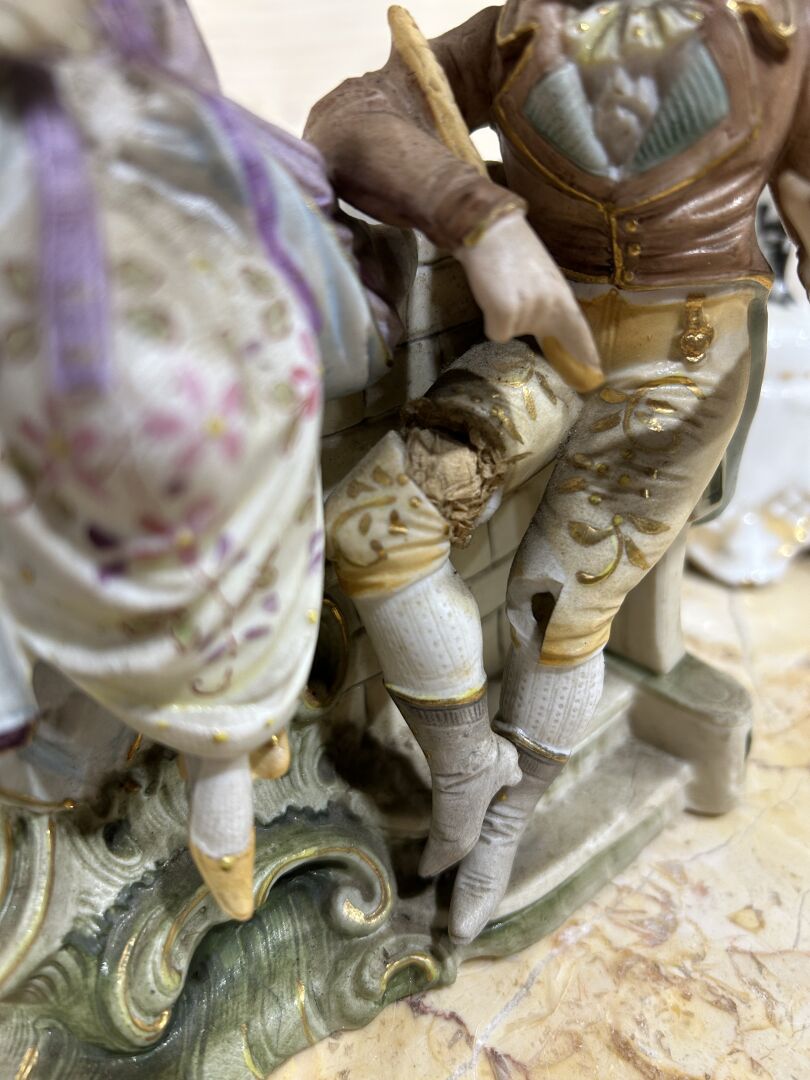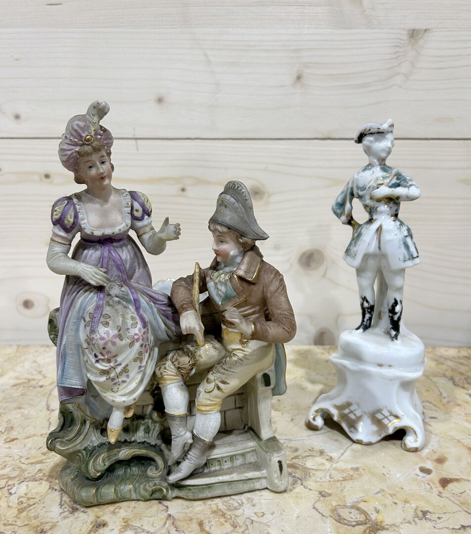 310 ESTIMATION: 10 / 20 € Ensemble comprenant un sujet en porcelaine figurant un musicien à décor polychrome et doré (manques de polychromie) et un vase en biscuit à décor en ronde bosse de scène galante polychrome Légers chocs H : 20 – 20.5 cm