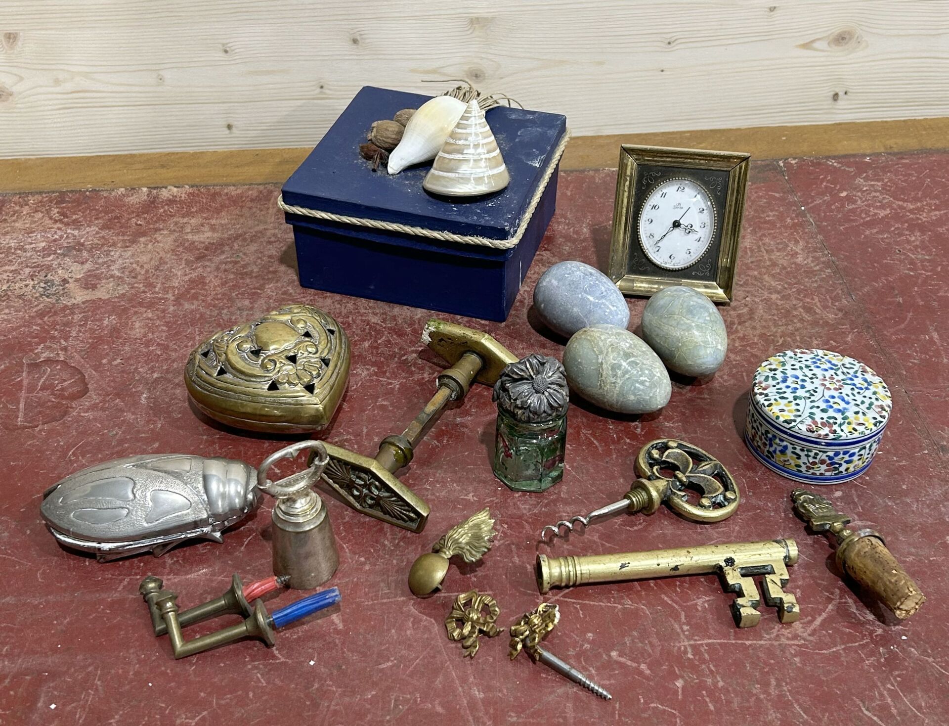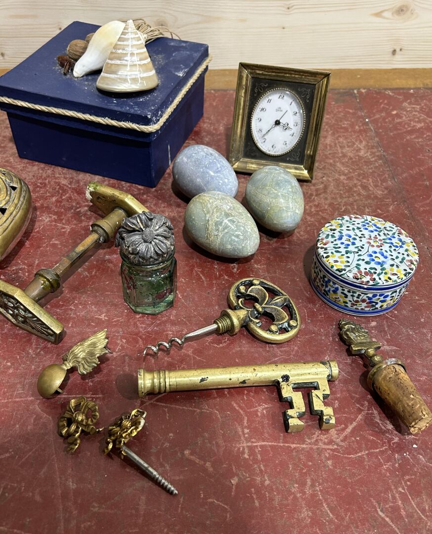 Ensemble d’objets de curiosité contenus dans une boite bleue, la prise ornée de coquillages comprenant une pendule de voyage, un tire bouchon clef, une pognée, deux boites dont une en forme de coeur, trois oeufs en pierre dure …