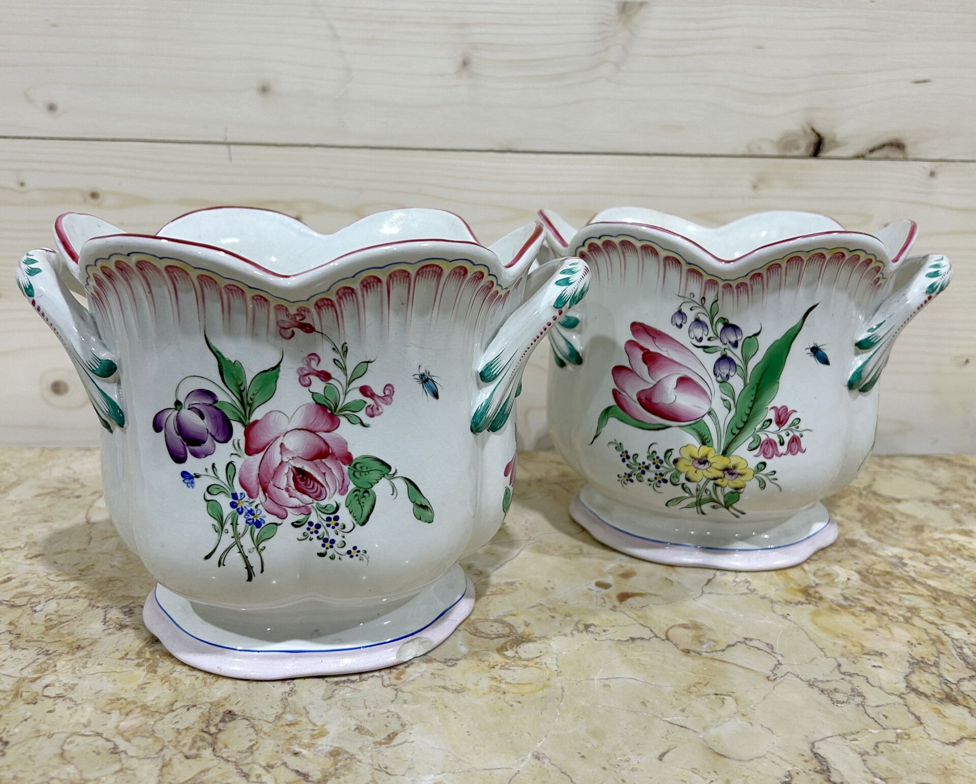 Paire de cache pots en faïence émaillée à décor de fleurs et insectes dans le gout des faïences de l’Est