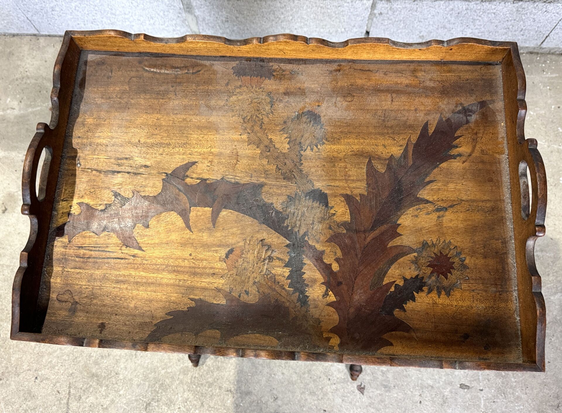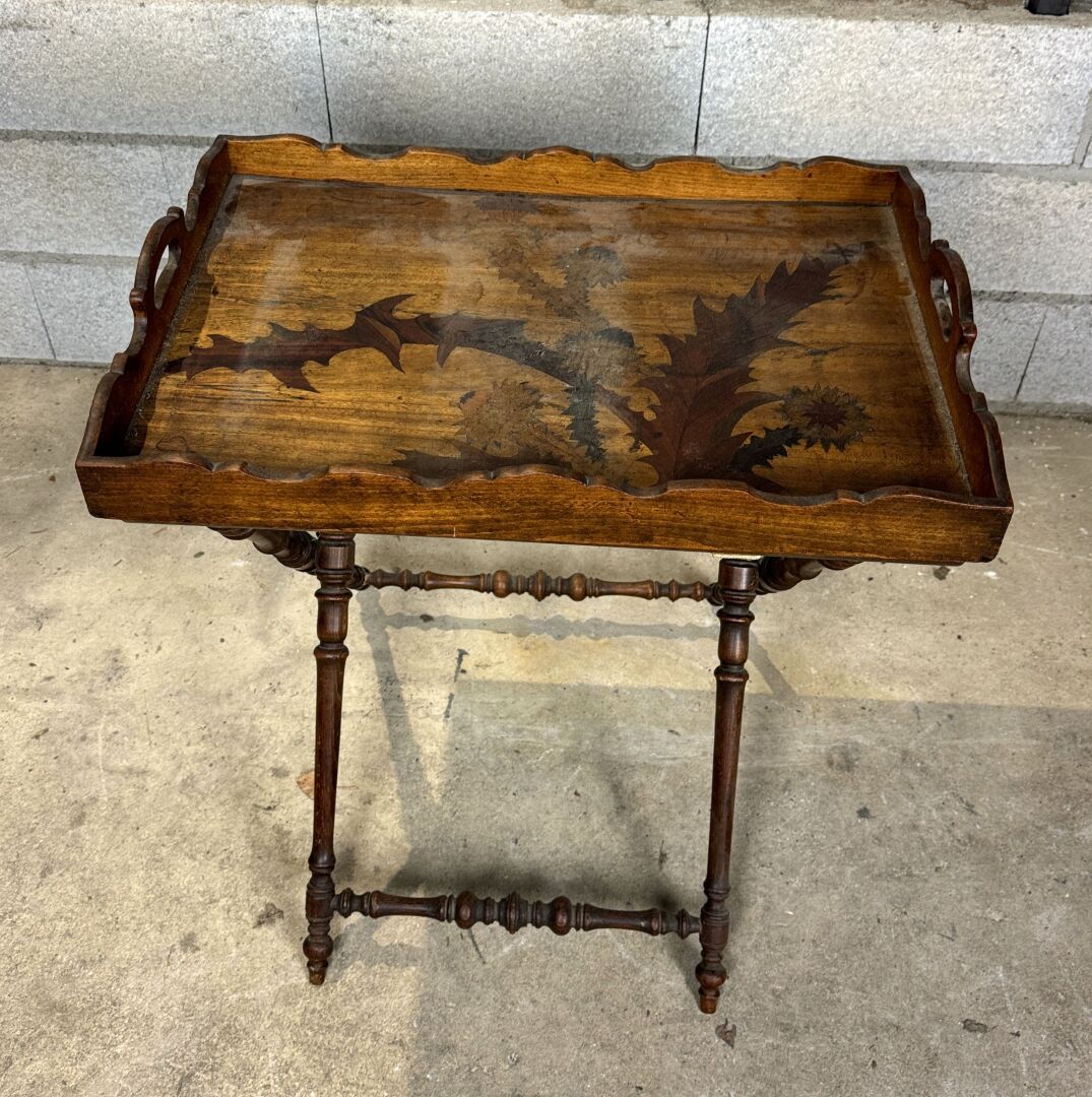 341 ESTIMATION: 20 / 30 € Plateau en marquèterie de bois reposant sur un trépied amovible Travail Art Nouveau Accidents et manques 55 x 44 cm pour le plateau