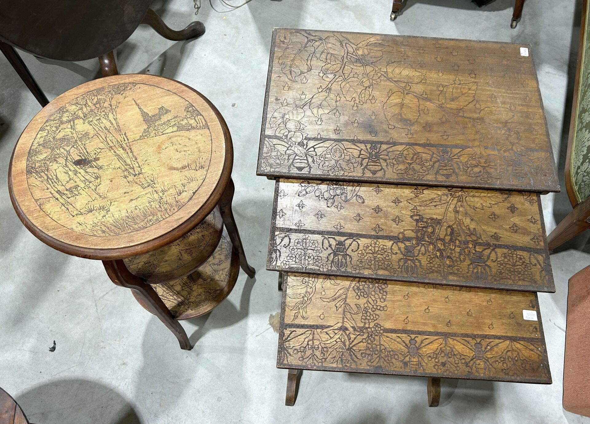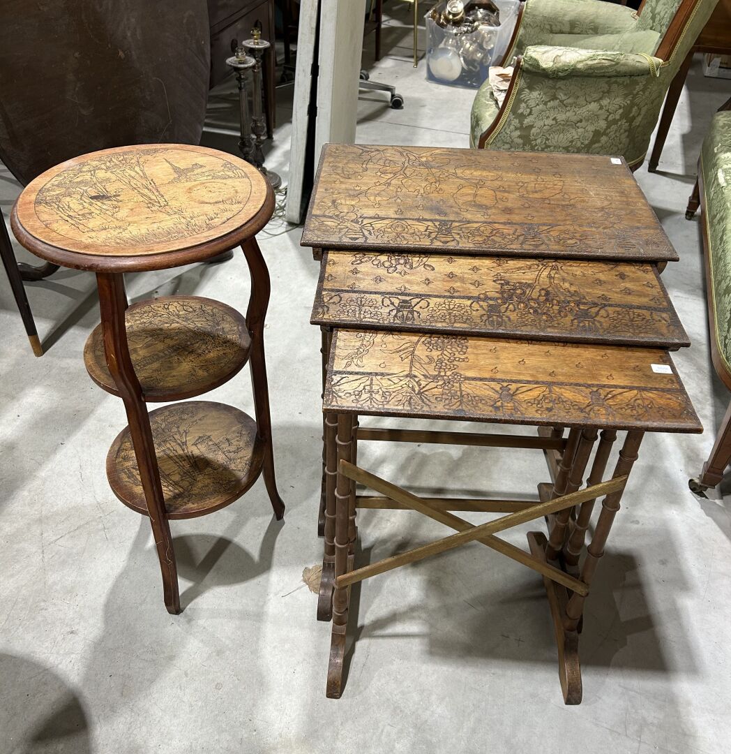 Trois tables gigogne bois gravé à décors Art Nouveau