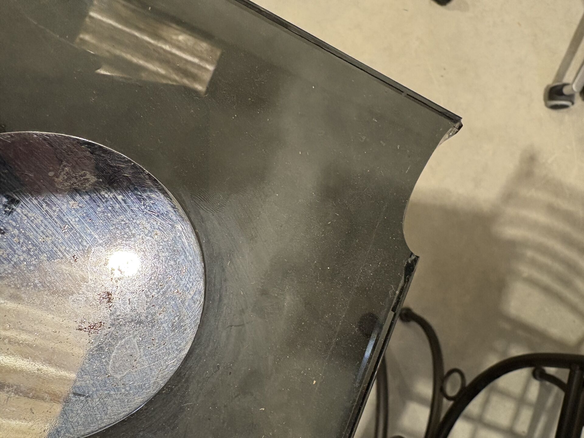 358 ESTIMATION: 50 / 80 € Console en verre fumé reposant sur quatre pieds cylindriques chromés Travail vers 1970 Angle accidenté H : 72 – L : 90 – P : 45 cm
